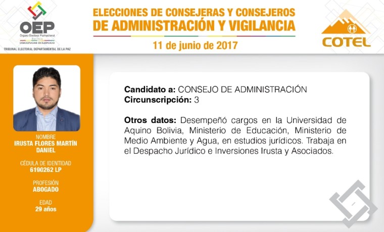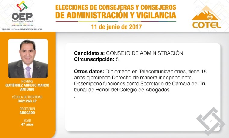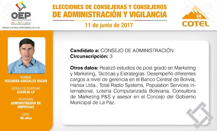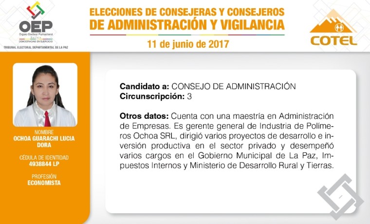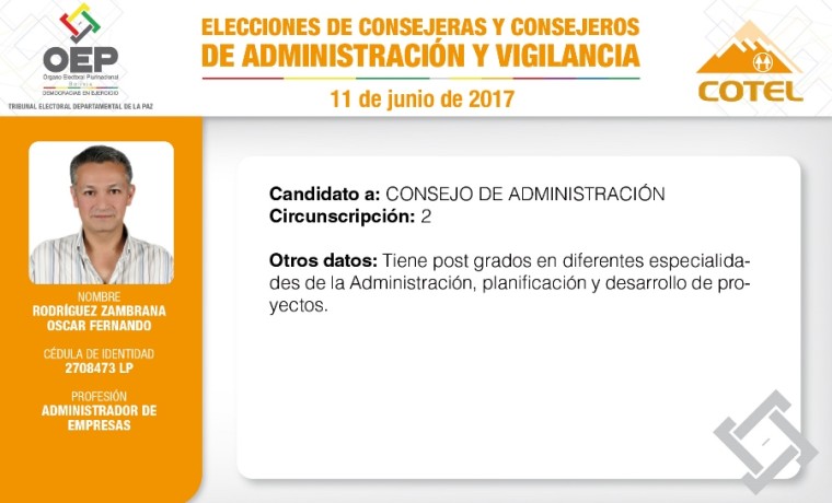 Son 27 candidatas y candidatos que pugnan en las elecciones de la Cooperativa de Teléfonos La Paz (COTEL), previstas para el 11 de junio. De ellos, 20 postulan al Consejo de Administración y siete al Consejo de Vigilancia.