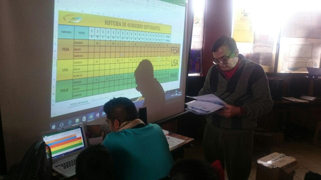 La elección en esta unidad educativa contó con la participación de 520 estudiantes que emitieron su voto por uno de los tres frentes que se presentaron: Frente Educativo Solidario en Acción (FESA), Unidos Siempre Adelante (USA) y Fuerza Honestidad Unión Educativa (FHUE). Durante el conteo de votos, se pudo ver que USA logró el apoyo de 209 votos, seguido por FHUE con 200, y FESA con 111.