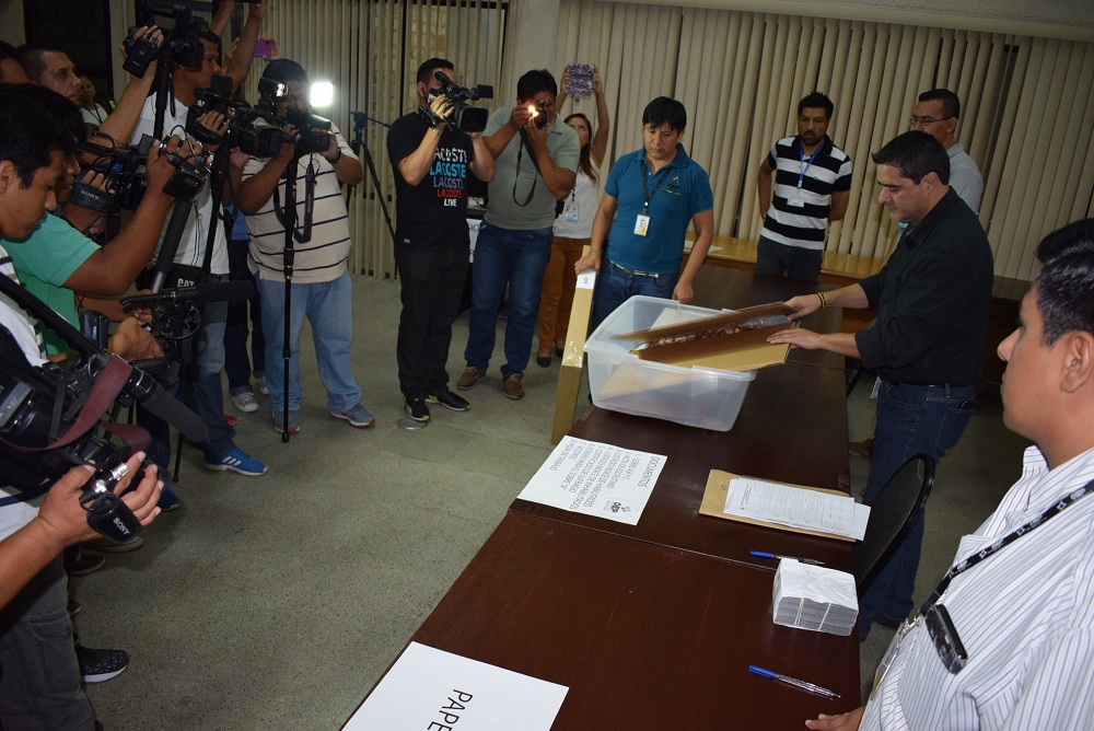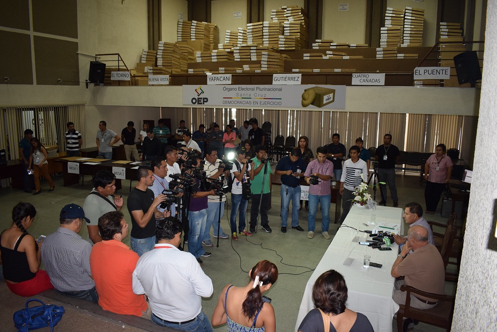 El presidente del Tribunal Electoral Departamental (TED) de Santa Cruz, Eulogio Núñez, mostró a los medios de comunicación cruceños el proceso de construcción de los kit electorales.