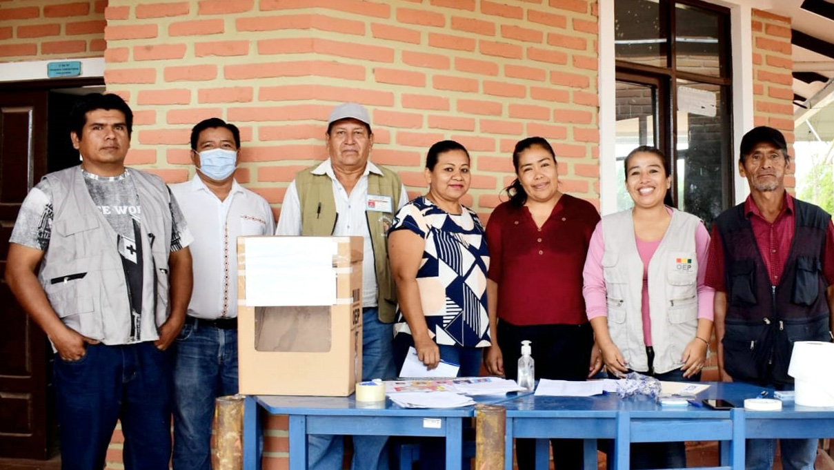 Autoridades del TED Santa Cruz, María Cristina Claros, presidenta y José MIguel Callejas, vicepresidente, y jurados electorales de mesas de sufragio, en la elección de los asambleístas en la zona Estacion Charagua.