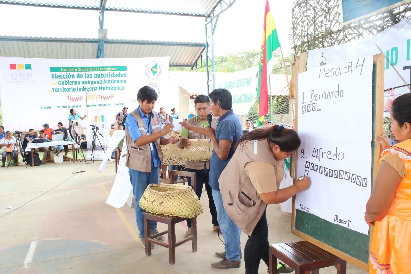 A primera hora de la mañana en el polifuncional de la unidad educativa de San José del Cavitu instalaron cinco mesas de sufragio, donde se controlaron las listas de delegados acreditados. Se utilizó canastas artesanales fabricadas con hoja de motacú, las cuales sirvieron de ánforas con mamparas del mismo material, que sirvieron para que cada persona emita su voto para elegir al Cacique.