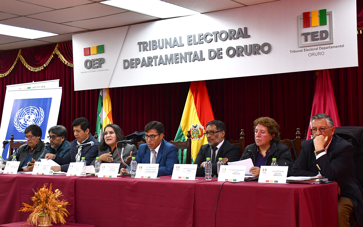 La presentación de la publicación del OEP tuvo la participación de los vocales del Tribunal Supremo Electoral Nancy Gutiérrez y Tahuichi Tahuichi, como también el representante del Programa de las Naciones Unidas para el Desarrollo (PNUD) en Bolivia, Fernando García. De la misma forma, participaron las autoridades del TED Oruro mediante el presidente Limber Arroyo, el vicepresidente Rudy Huayllas, el vocal Iver Pereira junto a las vocales Amelia Gutiérrez y Zelma López.