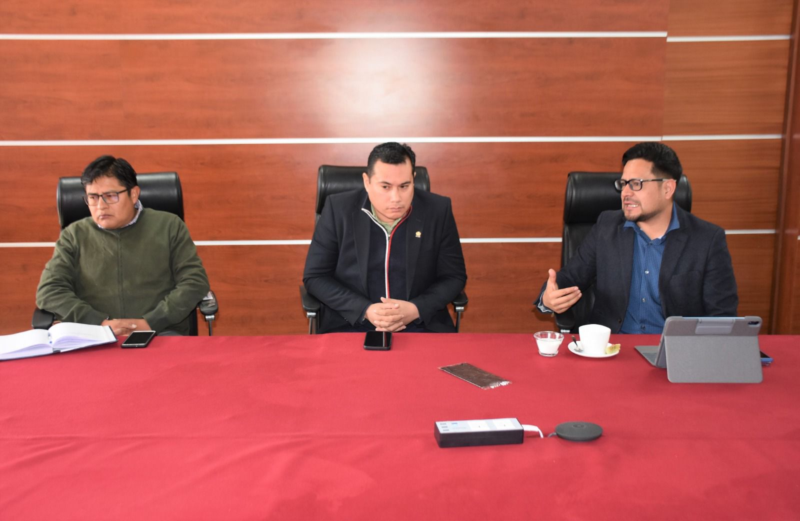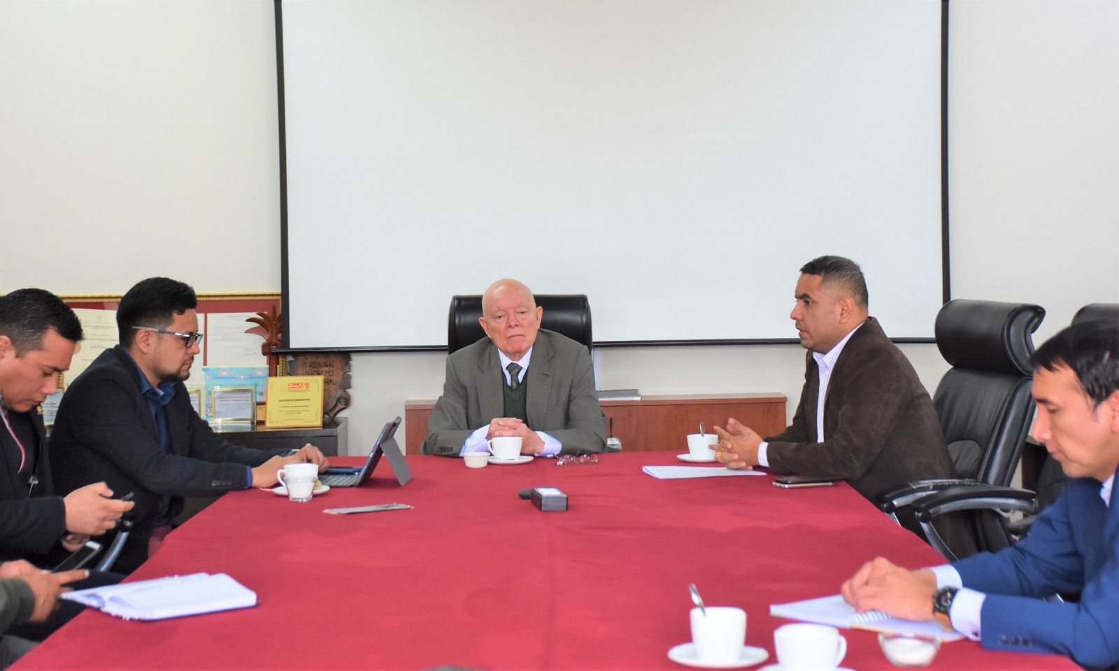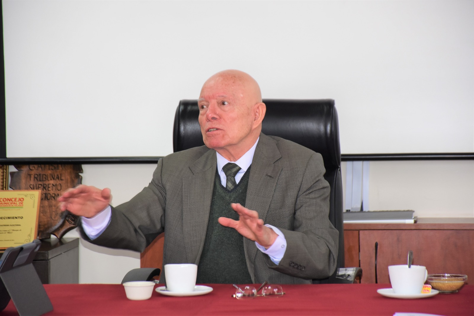 El presidente del Tribunal Supremo Electoral (TSE), Oscar Hassenteufel, junto al vicepresidente Francisco Vargas se reunieron con tres diputados de la organización política Comunidad Ciudadana (CC) a solicitud escrita del diputado Marcelo Pedrazas, quien forma parte de la bancada de esta alianza política, para que se les brinde información sobre el proceso de adjudicación referido a la actualización de la plataforma biométrica.