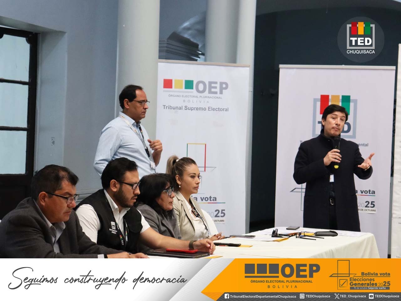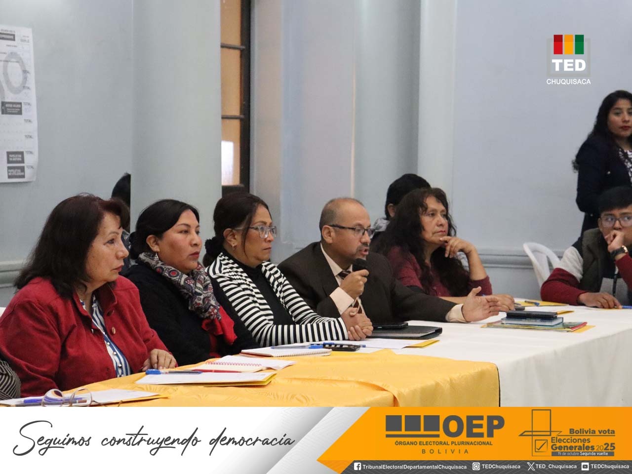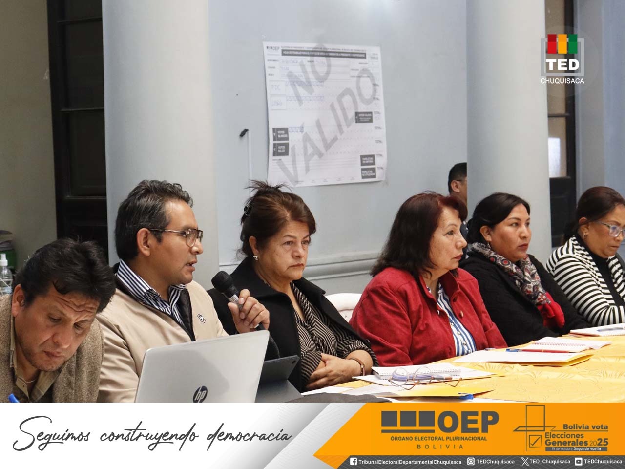 “Llevar adelante esta actividad con la participación plural de las organizaciones sociales, organizaciones políticas, observadores electorales, control social y delegados de las fuerzas políticas que participarán en la segunda vuelta del 19 de octubre cobra mayor relevancia en este día en el que recordamos el 43 aniversario del retorno de la democracia en nuestro país”, destacó el presidente del TED Chuquisaca, Mauricio del Río, al inaugurar la mesa técnica.