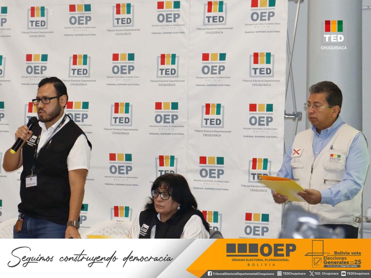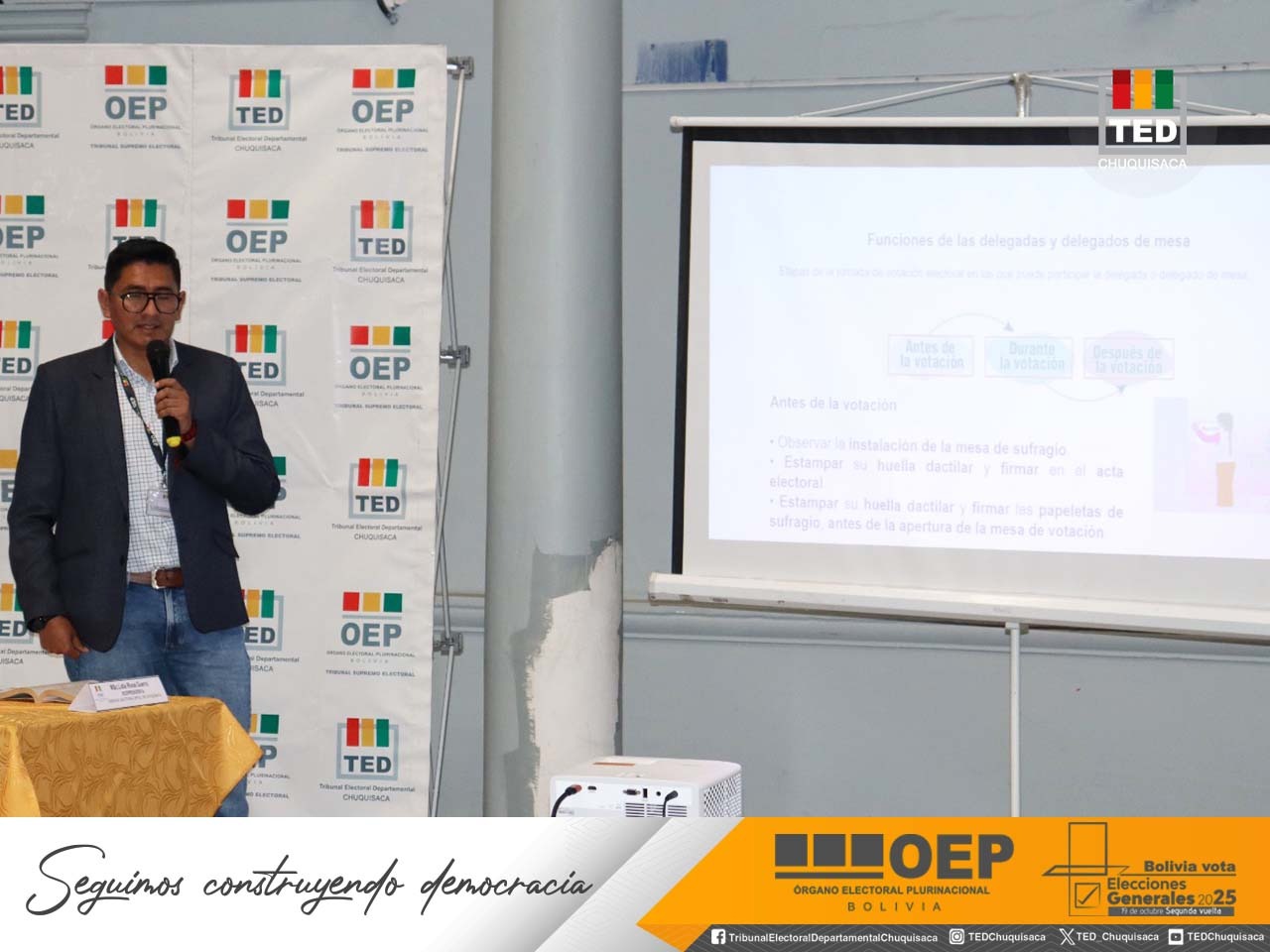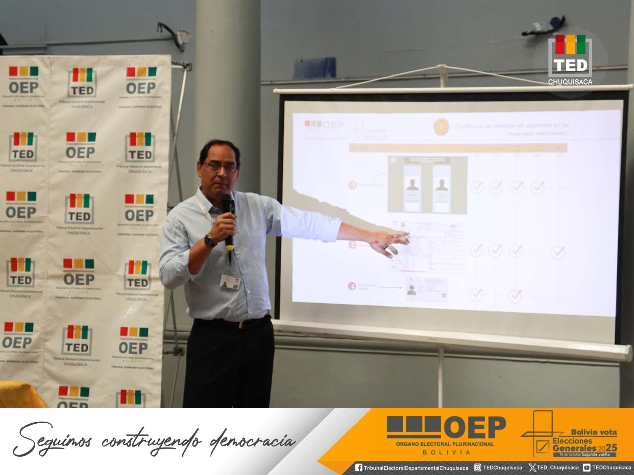 “Llevar adelante esta actividad con la participación plural de las organizaciones sociales, organizaciones políticas, observadores electorales, control social y delegados de las fuerzas políticas que participarán en la segunda vuelta del 19 de octubre cobra mayor relevancia en este día en el que recordamos el 43 aniversario del retorno de la democracia en nuestro país”, destacó el presidente del TED Chuquisaca, Mauricio del Río, al inaugurar la mesa técnica.