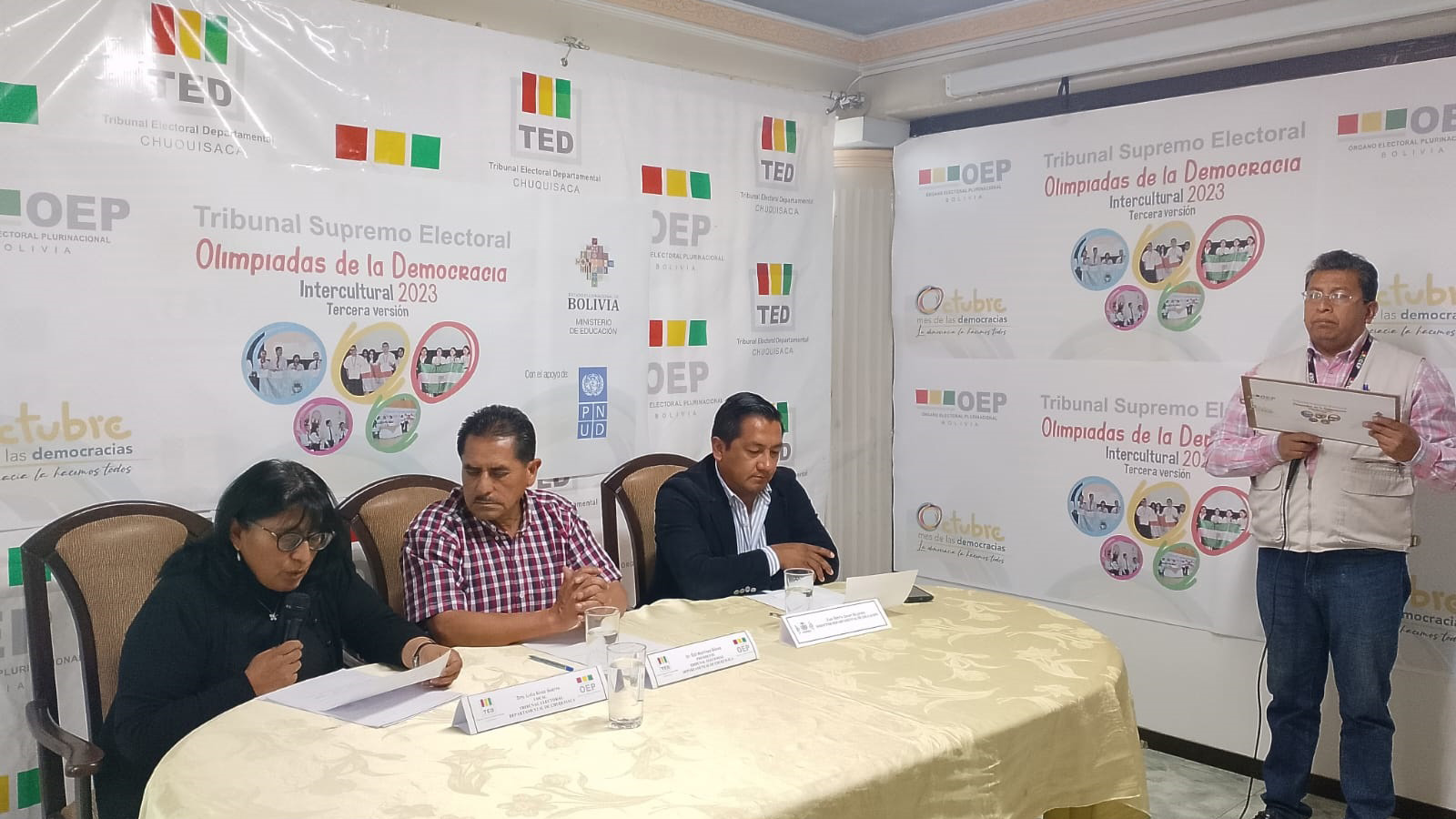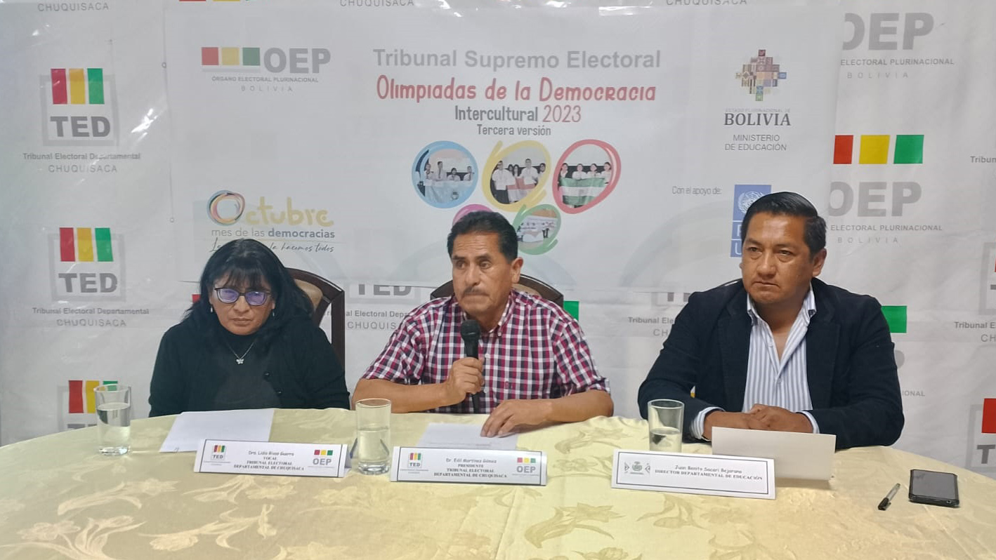 Este jueves 24 de agosto el presidente del Tribunal Electoral Departamental (TED) de Chuquisaca, Edil Martínez, la vocal del Servicio Intercultural de Fortalecimiento Democrático (Sifde), Lidia Rivas, y el Subdirector de Educación Regular de Chuquisaca, Ramiro Álvarez, inauguraron las Olimpiadas de Democracia Intercultural 2023 en su tercera versión.