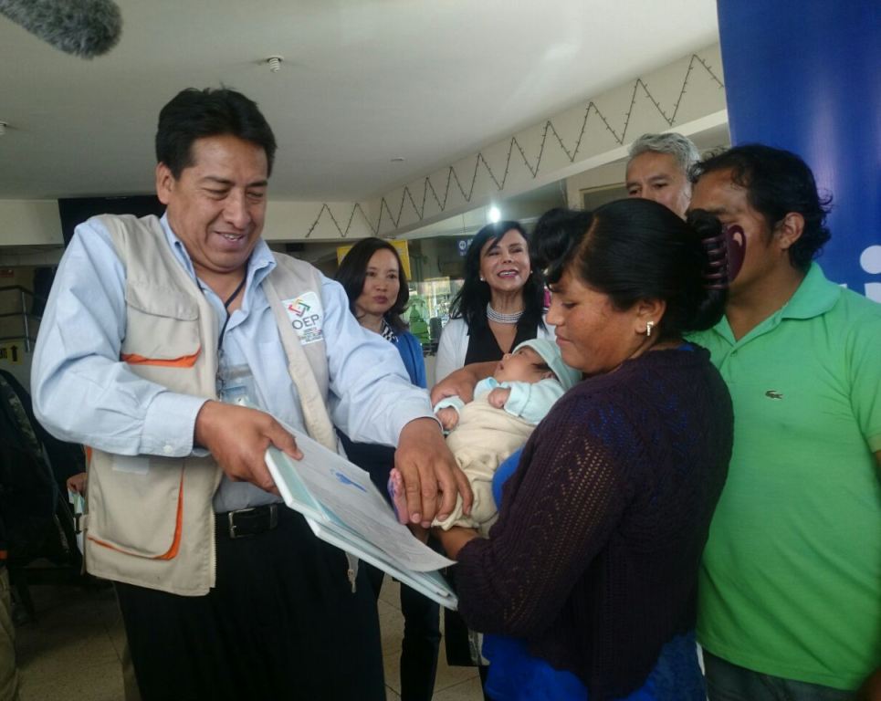 El Vocal del TSE, Antonio Costas, entrega el certificado de nacimiento a un recién nacido inscrito en la caseta registral del hospital Benigno Sánchez.