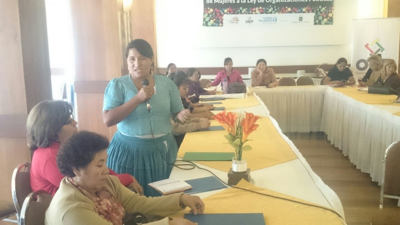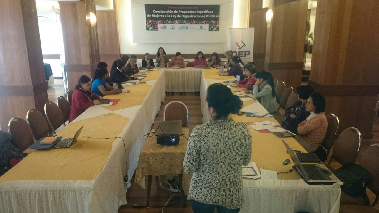 Las mujeres que participaron este martes en el taller de construcción de insumos para la propuesta de Ley de Organizaciones Políticas, que se realizó en Cochabamba, propusieron que la Ley de Organizaciones Políticas debe velar porque en los programas de las organizaciones políticas se incorporen temas referidos a género y despatriarcalización.