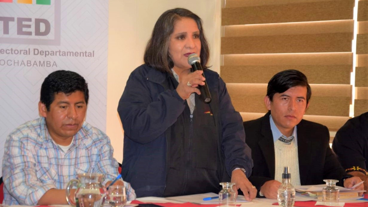 Presidenta en ejercicio del TSE, Nancy Gutiérrez se dirige a los delegados titulares y alternos de las agrupaciones ciudadanas de Cochabamba.