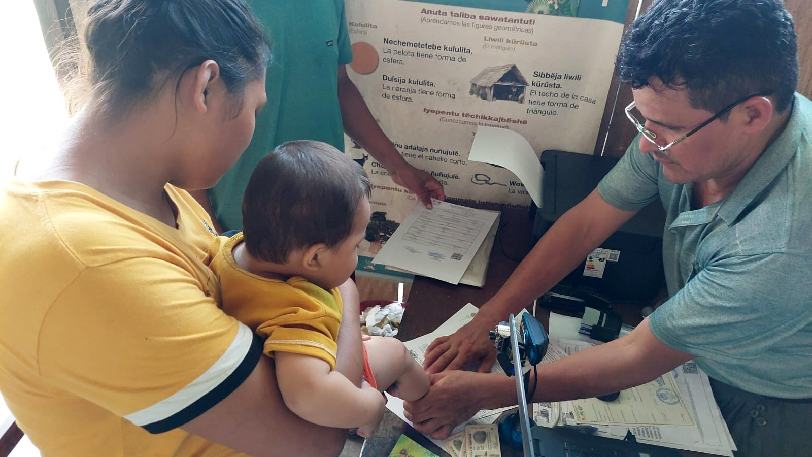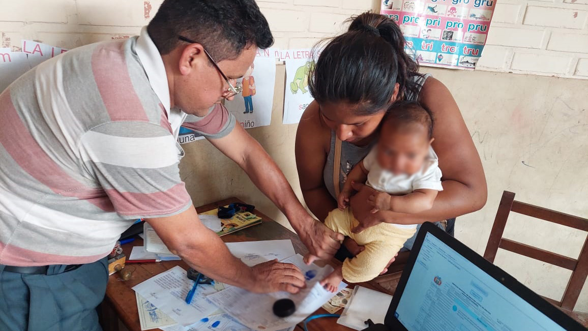 Una madre inscribe a su hijo con la brigada del Serecí que llegó a la comunidad de Biarecuate del Territorio Yuqui-Ciri en Cochabamba.