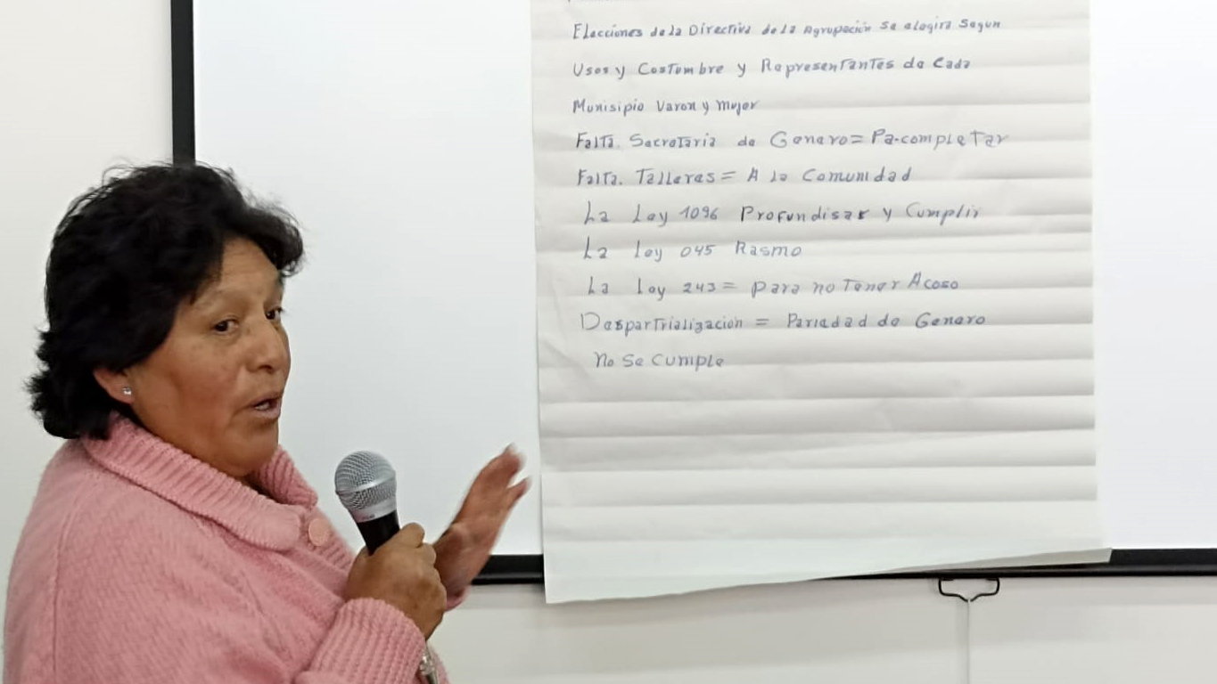 Mario Mamani Flores, representante de la agrupación Mirando el Desarrollo de Luribay (Midelur) aseguró que su estatuto tiene “muchos vacíos, y que gracias a este taller tenemos las herramientas necesarias para subsanar y tener una secretaria de despatriarcalización en nuestro estatuto”.