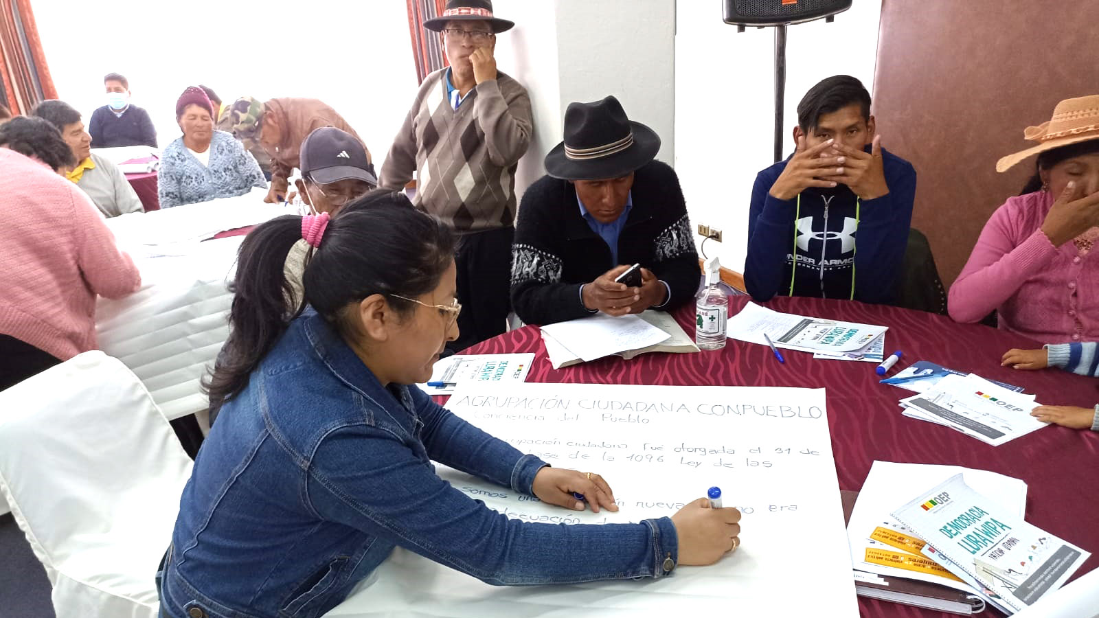 Soberanía y libertad (Sol.bo), Venceremos, Suma Escoma, Mirando el Desarrollo de Luribay (Midelur), Nueva Opción Social (Nos), Levantamiento de Unidad Social, Movimiento Tierra y Libertad (MTL), Movimiento Por la Soberania (MPS), Con Pueblo, Sicus, Inti y Alianza Social Patriótica (Asp), son las agrupaciones ciudadanas que participaron del taller denominado "Análisis sobre la participación de las mujeres en las organizaciones políticas y presentación de la oferta de formación", organizado por el Tribunal Electoral Departamental (TED) La Paz y el Sifde, el viernes 18 de noviembre.