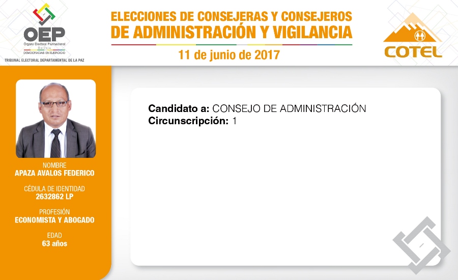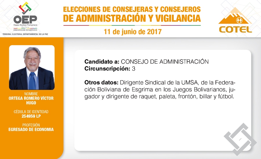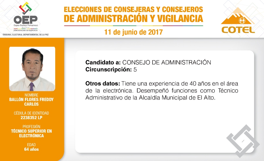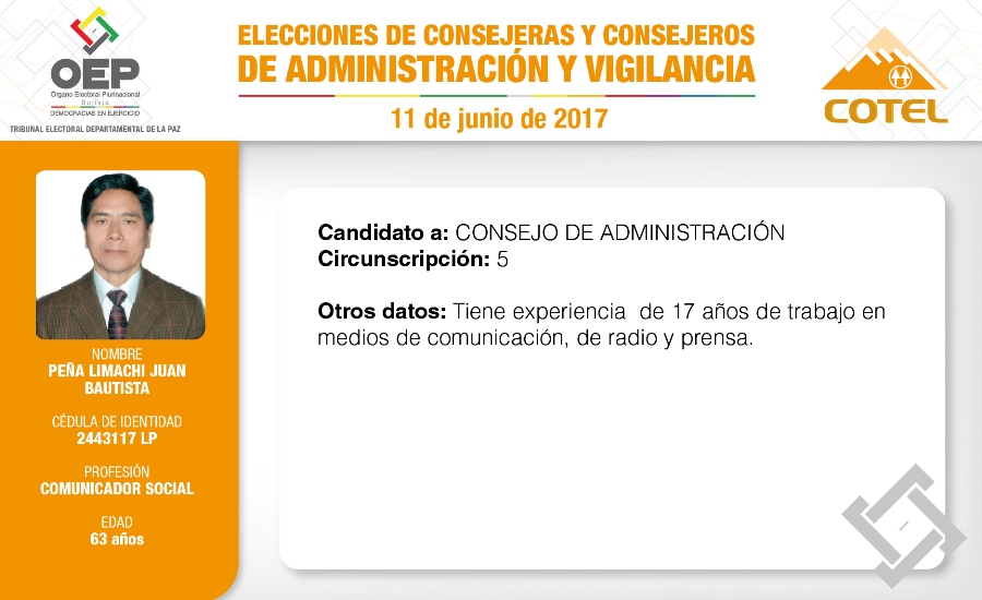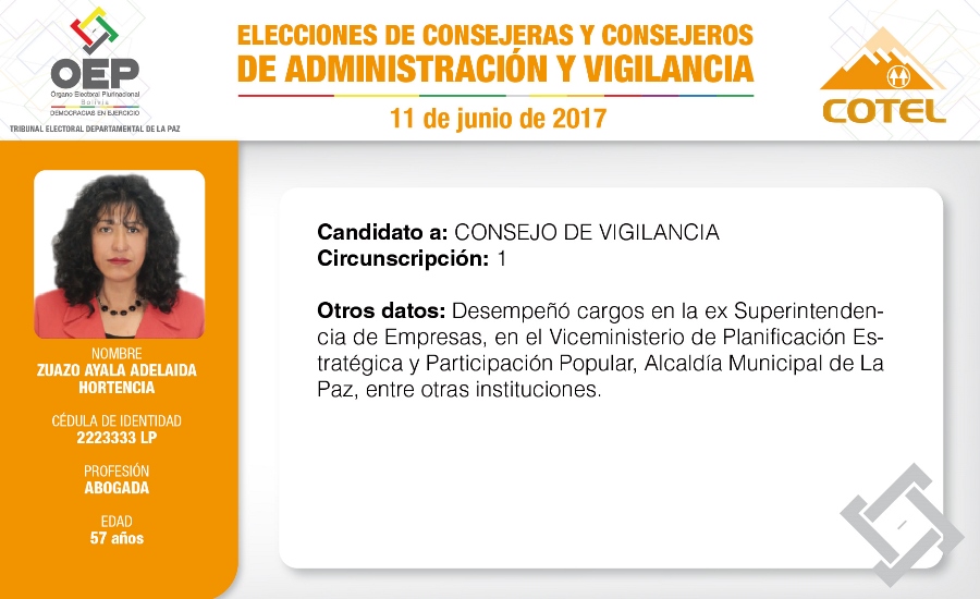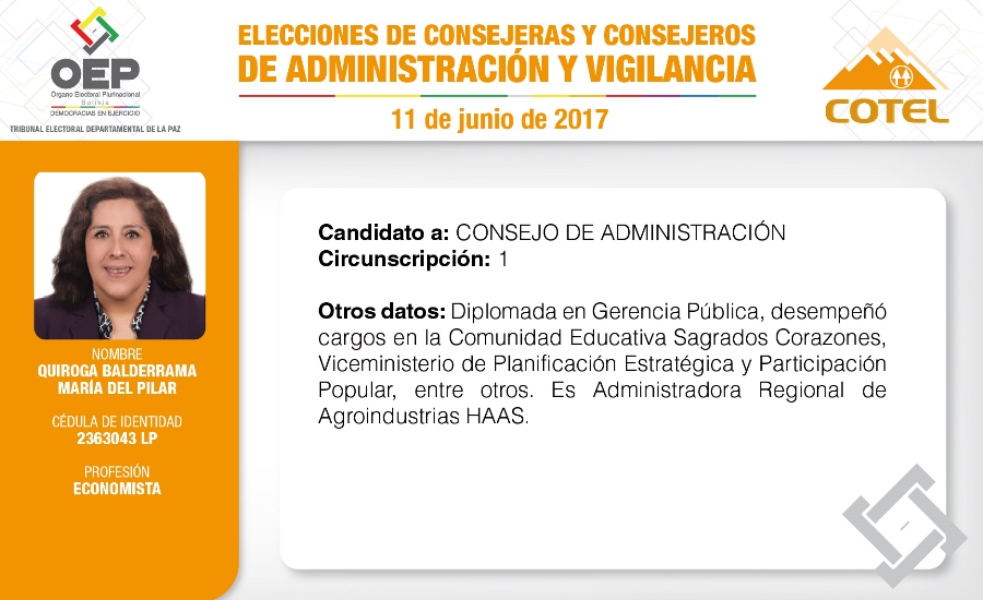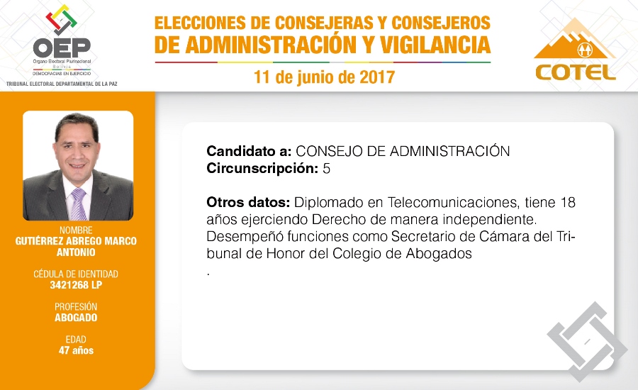 Son 27 candidatas y candidatos que pugnan en las elecciones de la Cooperativa de Teléfonos La Paz (COTEL), previstas para el 11 de junio. De ellos, 20 postulan al Consejo de Administración y siete al Consejo de Vigilancia.