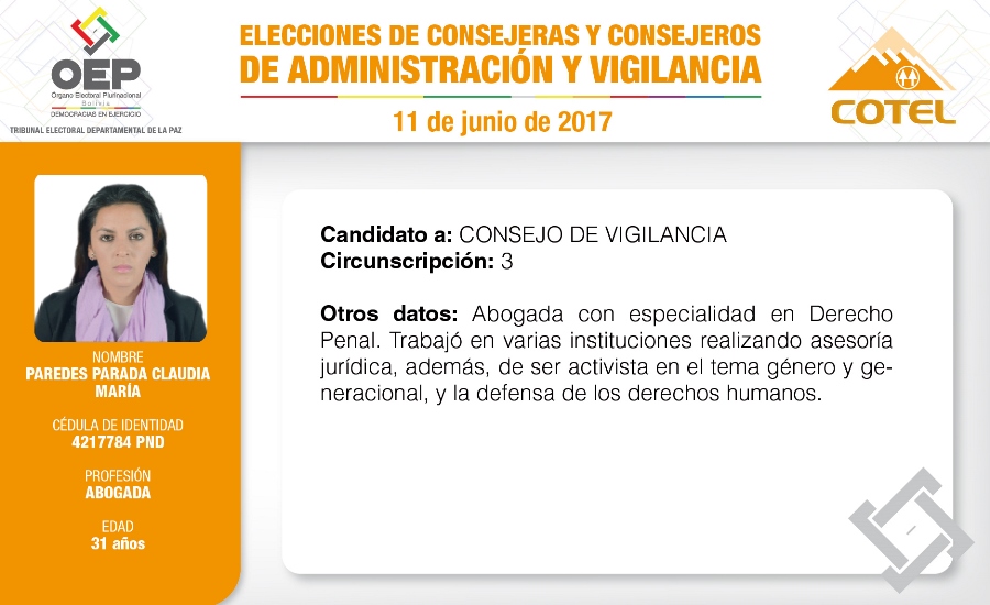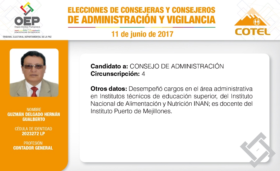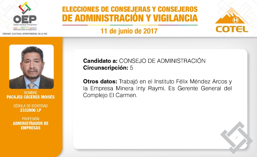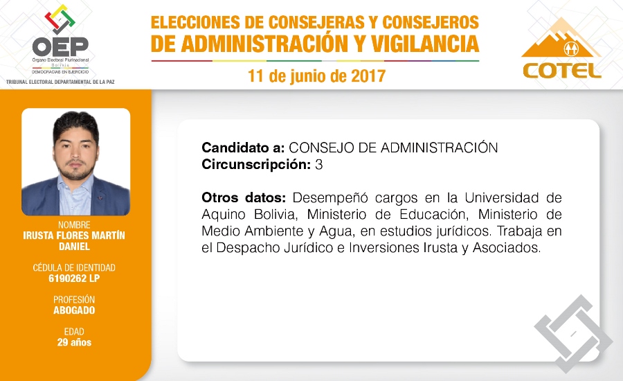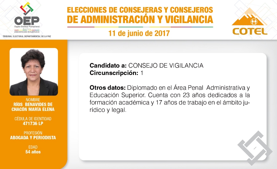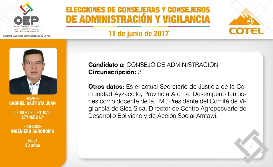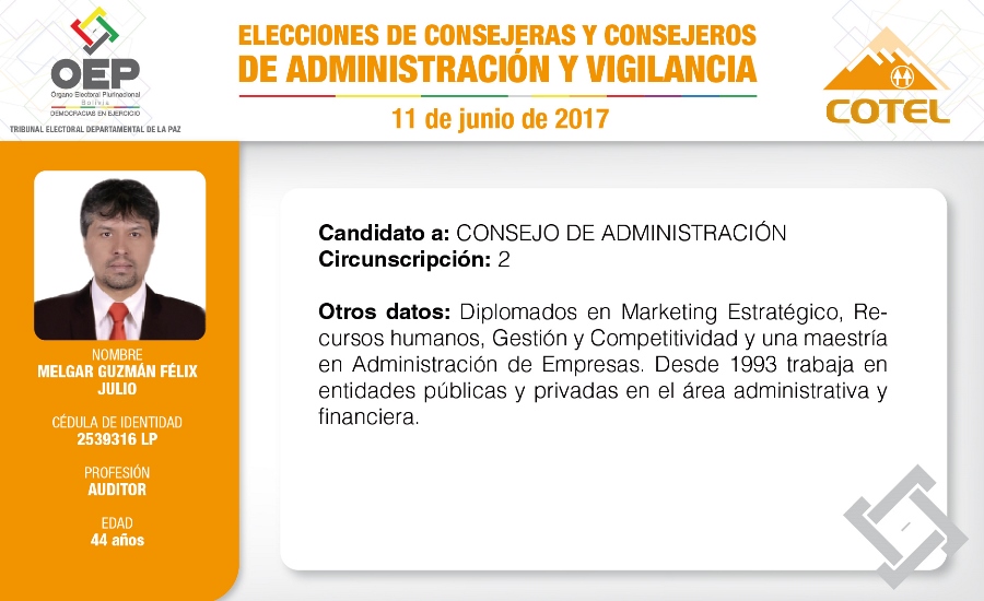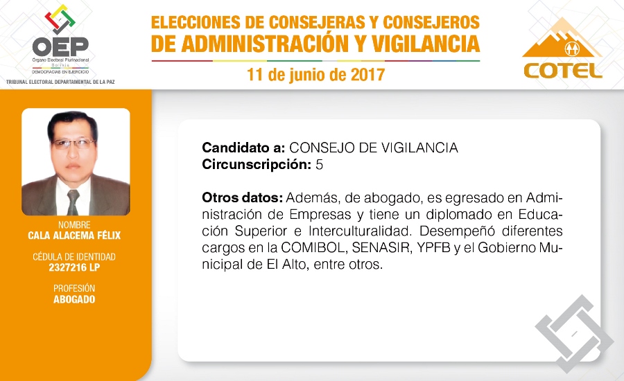 Son 27 candidatas y candidatos que pugnan en las elecciones de la Cooperativa de Teléfonos La Paz (COTEL), previstas para el 11 de junio. De ellos, 20 postulan al Consejo de Administración y siete al Consejo de Vigilancia.
