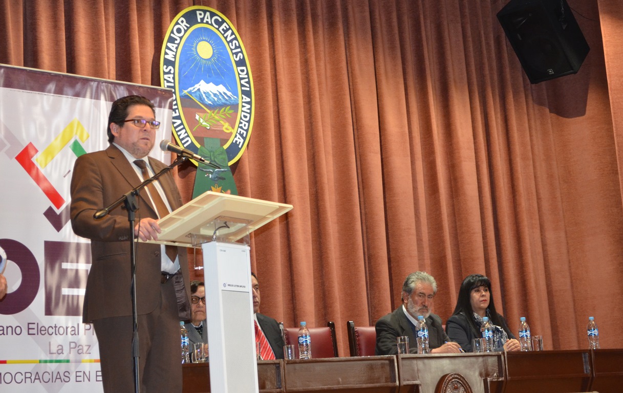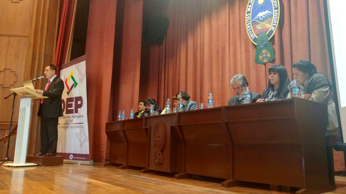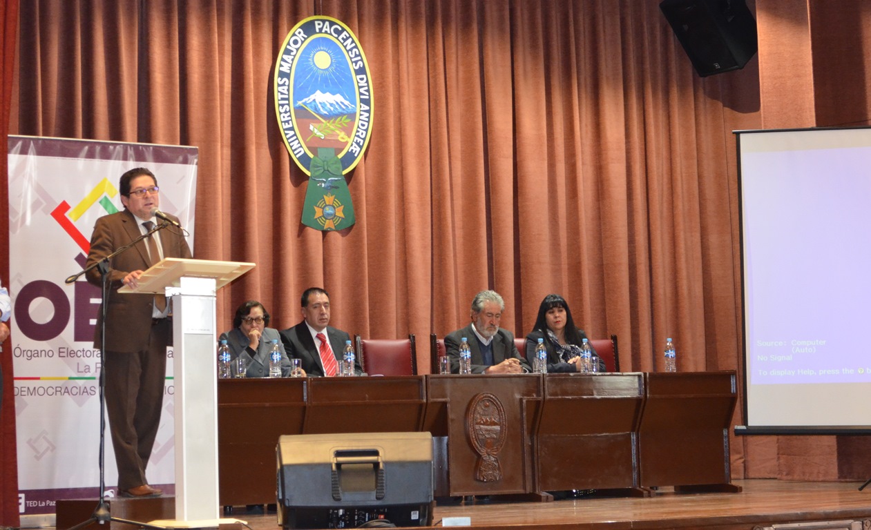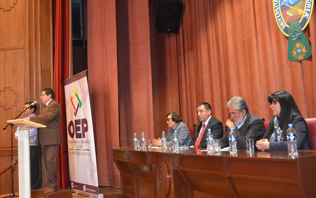 El seminario que se realizó en el marco de las actividades del proyecto “Octubre, mes de las democracias”, y es impulsado por el Órgano Electoral Plurinacional en Todo el País, contó con la presencia de los Vocales del TSE, Jose Luis Exeni, Maria Eugenia Choque y Lucy Cruz; el periodista Carlos Soria Galvarro, la Representante Departamental de La Paz de la defensoría del Pueblo, Teresa Subieta; y el docente de la Universidad Mayor de San Andrés, Jaime Mamani.