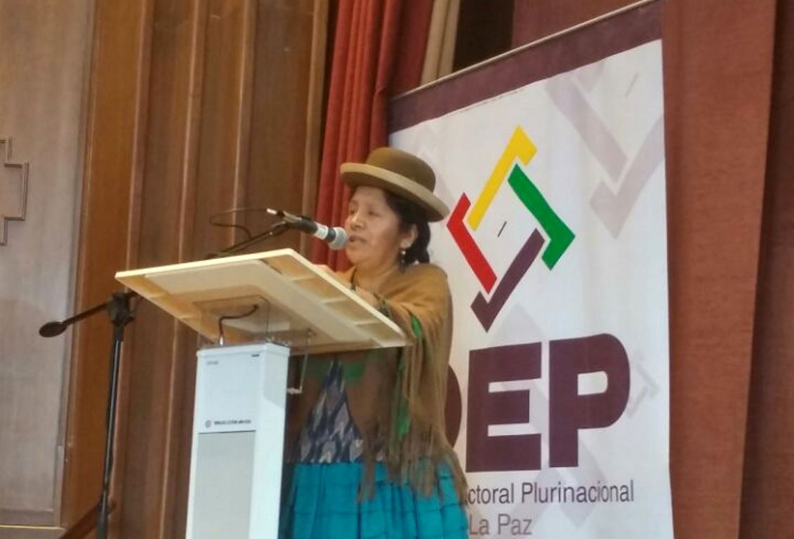 La vocal del TSE, Maria Eugenia Choque, se refirió a la participación política de la mujer indígena en democracia, donde resaltó el reconocimiento de la participación y aporte en los procesos de construcción de las normas básicas autonómicas.