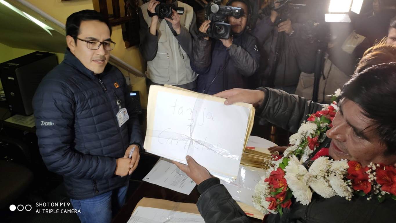 A las 23:19 horas, la delegación del Movimiento Tercer Sistema ingresó al TSE; le siguieron casi inmediatamente Unidad Cívica Solidaridad (UCS), que ingresó a las 23:33; la alianza Bolivia Dice No, a las 23:46; la alianza Comunidad Ciudadana (CC), a las 23:50; el Frente Para la Victoria (FPV), a las 23:55; el Partido Demócrata Cristiano (PDC), a las 23:58; y finalmente el Partido de Acción Nacional Boliviano (PAN-Bol), a las 23.59.