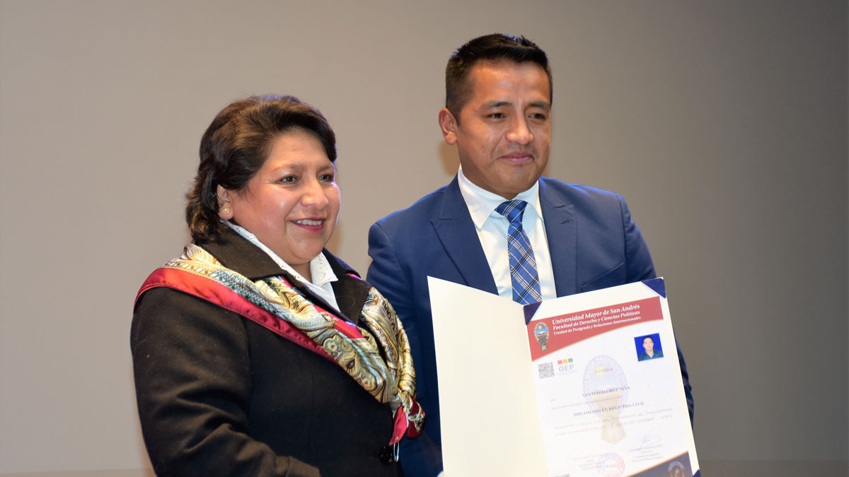 Posteriormente, el coordinador del Diplomado en Registro Civil de la UMSA, Ariel Benavides, resaltó que gracias al convenio que se tiene con el TSE se pudo contar con docentes de probada experiencia, que refuerzan los conocimientos teóricos con la experiencia práctica de los facilitadores. Enfatizó que debido al requerimiento que existe de la sociedad se pretende desarrollar el diplomado en la siguiente gestión, con el apoyo del Servicio Intercultural de Fortalecimiento Democrático (Sifde), dependiente del TSE.