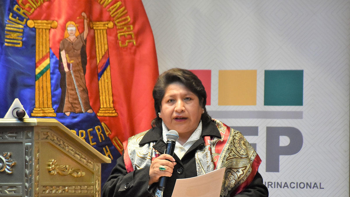 En primera instancia hizo uso de la palabra la vocal Dina Chuquimia, quien brindó datos relevantes del diplomado y del convenio entre la UMSA y el TSE. “Este Diplomado tuvo como objetivo formar profesionales con capacidad de análisis y conocimientos normativos, teóricos y prácticos sobre la institucionalidad y gestión del sistema de registro civil y electoral, con la finalidad de fortalecer el ejercicio de los derechos políticos, civiles, y la cultura democrática y registral en el Estado Plurinacional de Bolivia”, destacó.