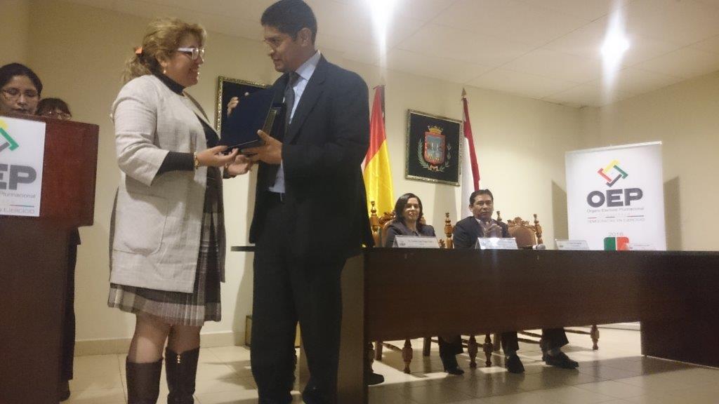 El reconocimiento fue entregado en el marco de las actividades programadas por Octubre, mes de las democracias, en conmemoración a los 34 años de recuperación de la democracia en Bolivia.