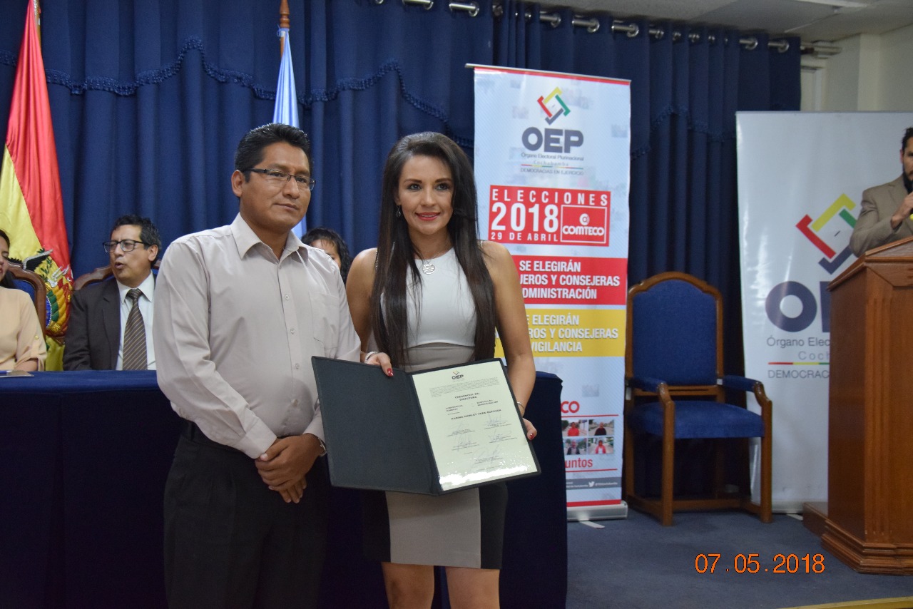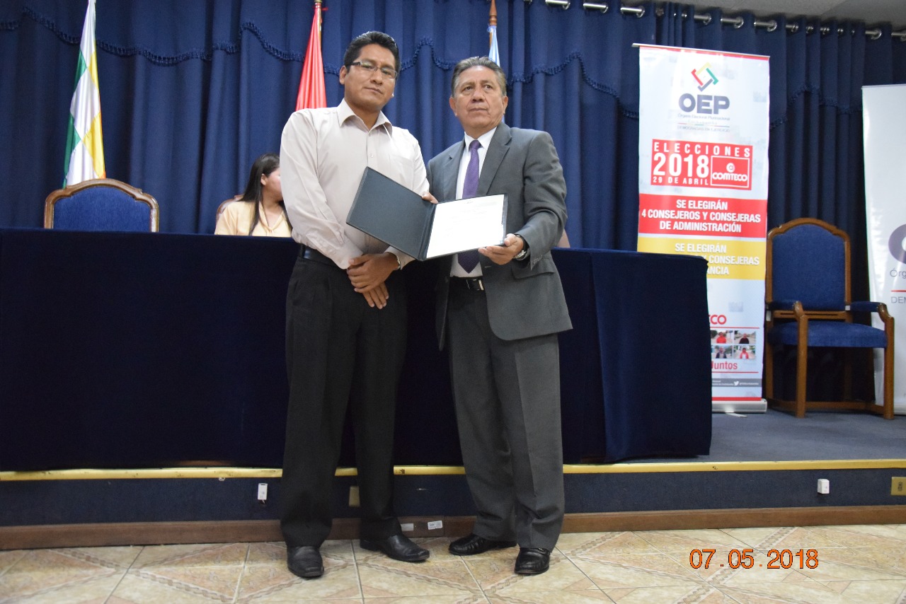 La Sala Plena del Tribunal Electoral Departamental (TED) de Cochabamba entregó este lunes 7 de mayo, las credenciales a las y los cuatro consejeros del Consejo de Administración y cuatro de Vigilancia de la Cooperativa de Telecomunicaciones de Cochabamba (COMTECO) que fueron electos el 29 de abril.