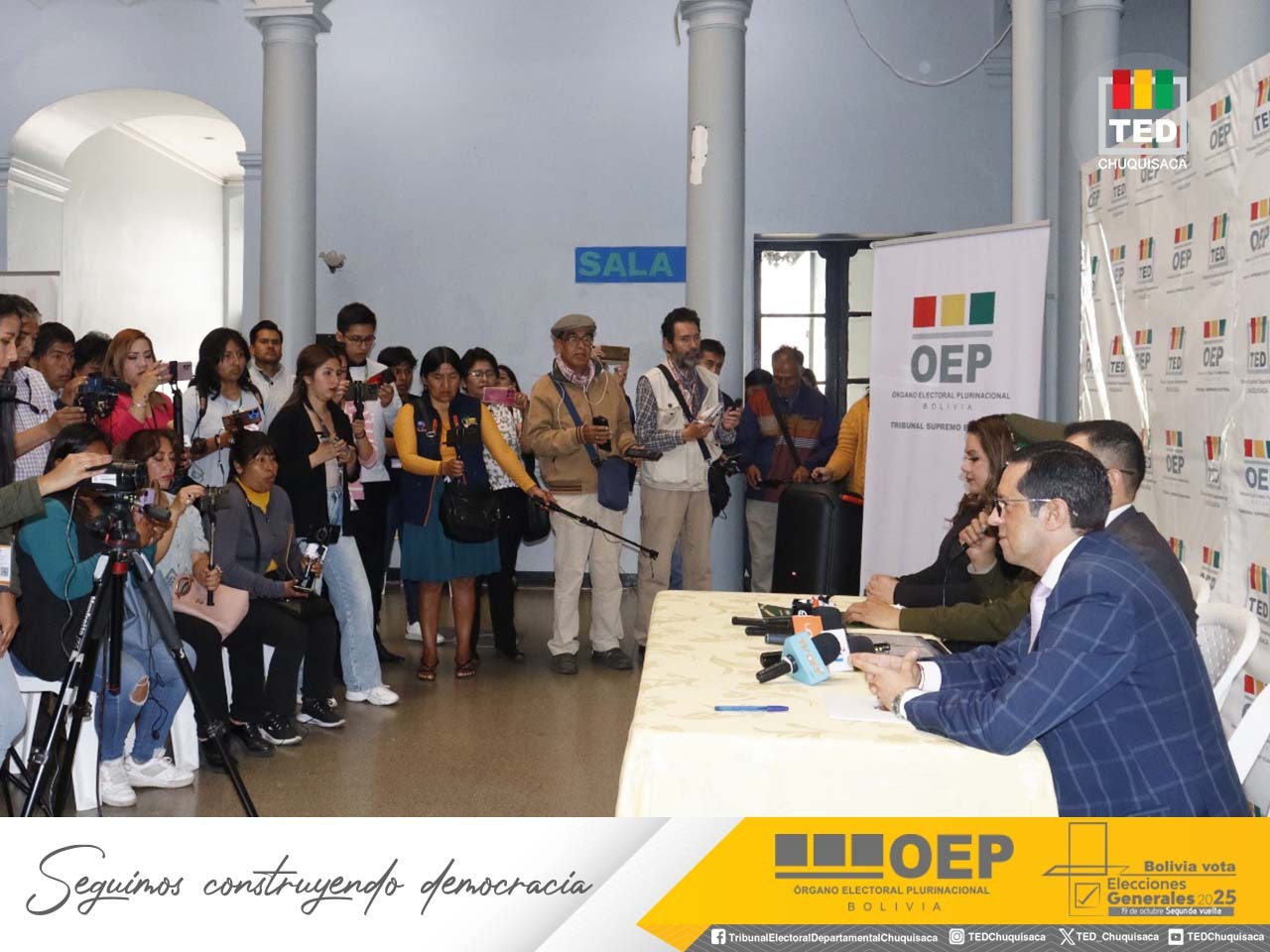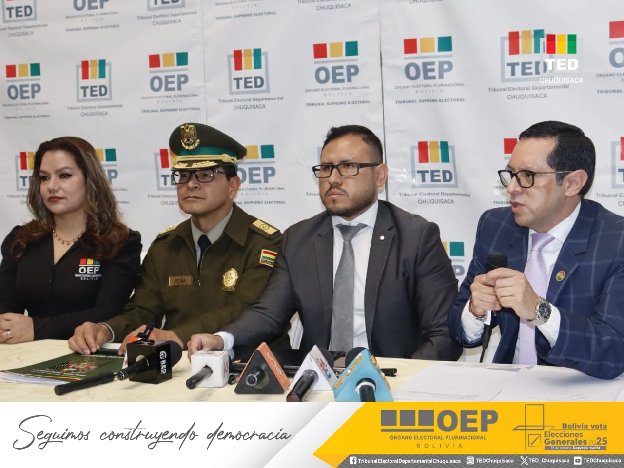 “Estamos en la recta final de este proceso electoral y estamos ejecutando las tareas de manera coordinada entre las distintas instituciones”, destacó el presidente del TED Chuquisaca, Mauricio del Río, acompañado por la vocal Ximena Camacho, el fiscal departamental de Chuquisaca, Mauricio Nava Morales, y el comandante departamental de la Policía de Chuquisaca, coronel Juan Román Peña.