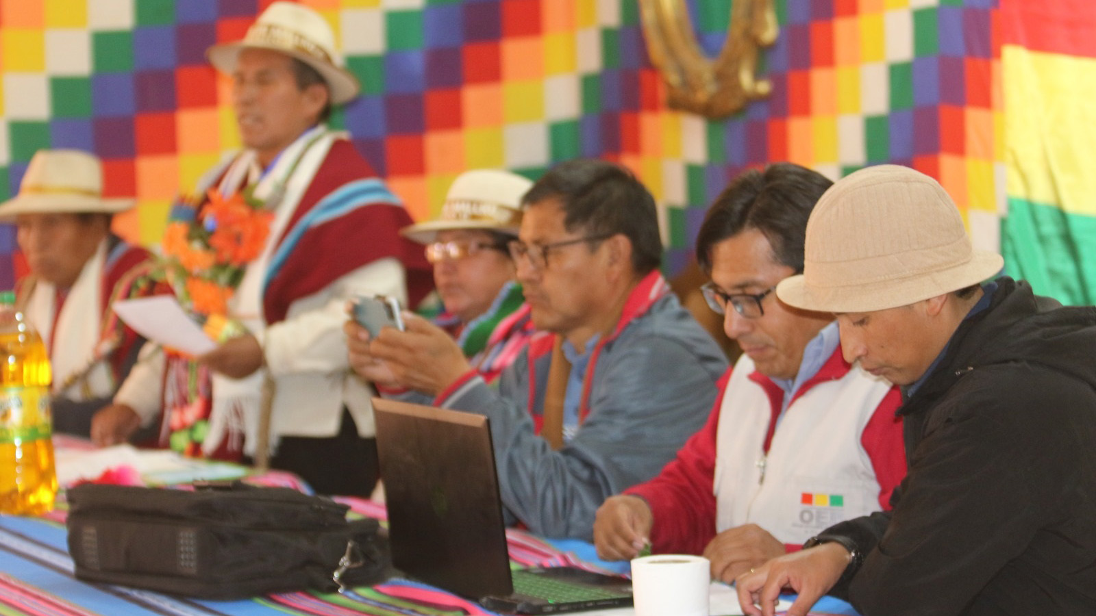 La autoridad originaria Tata Jiliri Diego Sergio Calle, junto a su Mama Jiliri, Silvia Vicente de Calle, presidieron la reunión y agradecieron la información a las autoridades de las markas y comunidades del distrito Mayasthasita Markanakas que asistieron. También estuvo Emilio Aguilar Choque, como miembro de la Coordinadora Nacional de Autonomías Indígena Originario Campesinas.