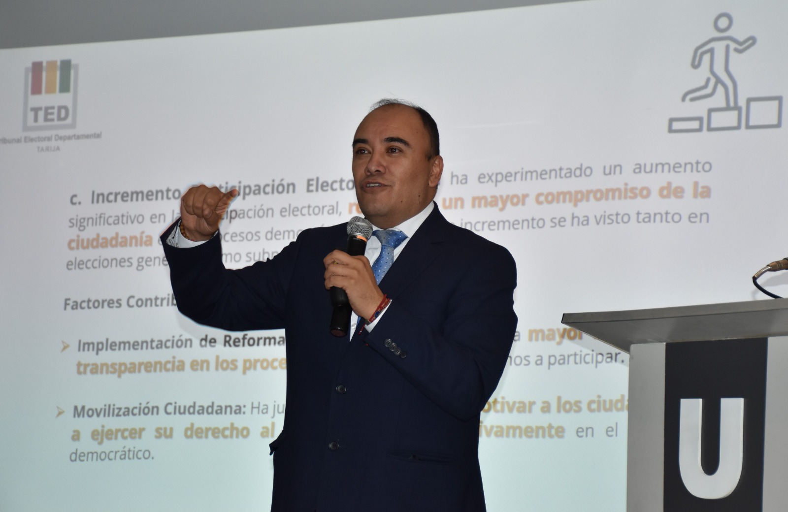 En el segundo panel se abordó el tema Democracia Intercultural y estuvo a cargo del presidente en ejercicio del TED Tarija, Oscar Gutiérrez, quien durante su presentación explicó ampliamente el ejercicio de los tres tipos de democracia: Representativa, Comunitaria, y Directa y Participativa, además de la importancia de promover un diálogo abierto y constructivo sobre esta temática. La autoridad resaltó que estos eventos son fundamentales para escuchar diferentes perspectivas y trabajar juntos hacia un sistema más inclusivo y representativo.
