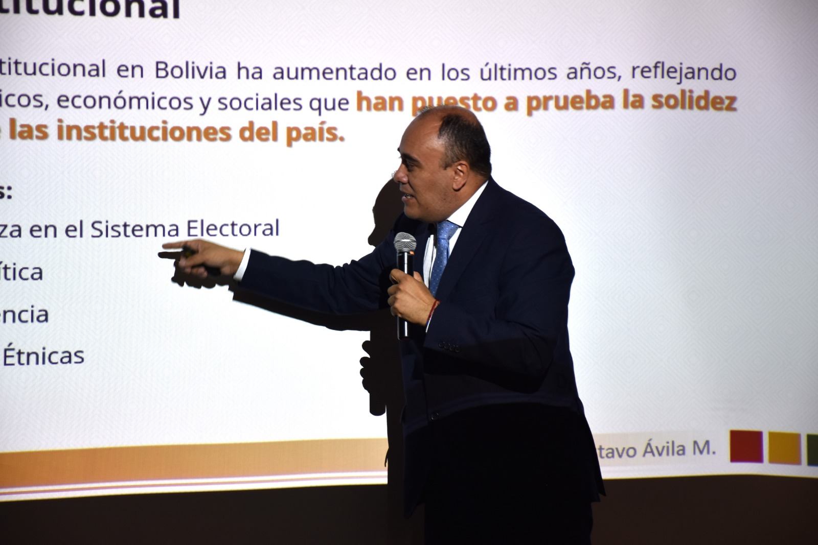 Durante el evento se desarrollaron dos paneles, el primero a cargo del vocal del Tribunal Supremo Electoral Gustavo Ávila, quien abordó el tema Democracia: Avances, Riesgos y Desafíos, promoviendo la reflexión de las y los presentes en torno a la edificación de la democracia en Bolivia, a través de la presentación de un análisis que permitió identificar los principales logros, riesgos y desafíos político-institucionales del ejercicio de la democracia en Bolivia.