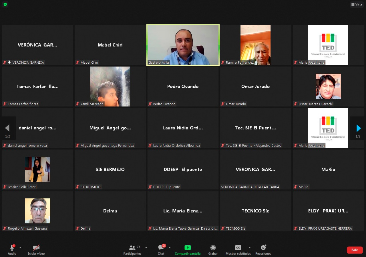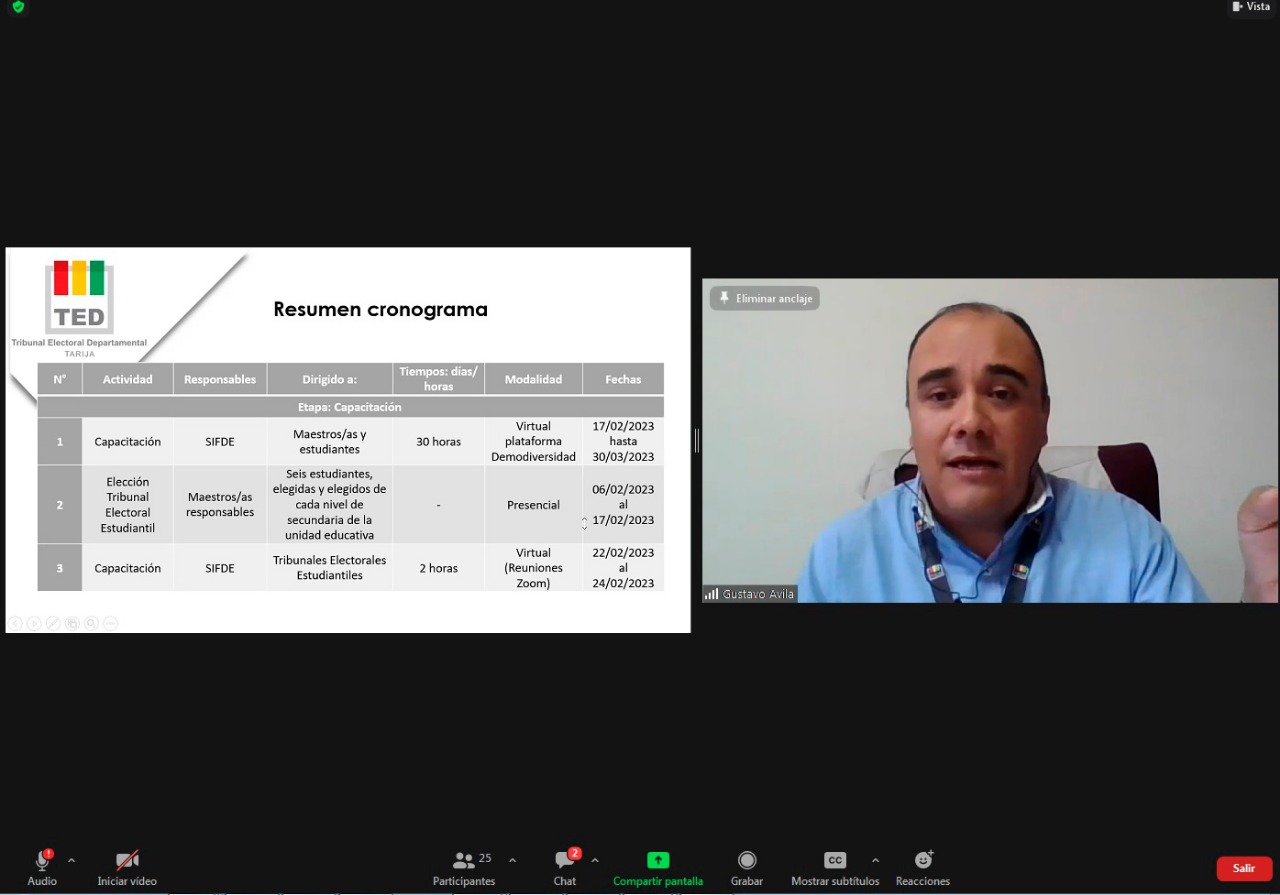 En una reunión virtual realizada este 24 de enero, el Tribunal Electoral Departamental (TED) de Tarija, a través del Servicio Intercultural de Fortalecimiento Democrático (Sifde), socializó con los directores distritales de educación de los 11 municipios del departamento el cronograma para la conformación de gobiernos estudiantiles, a realizarse el 31 de marzo de la presente gestión.