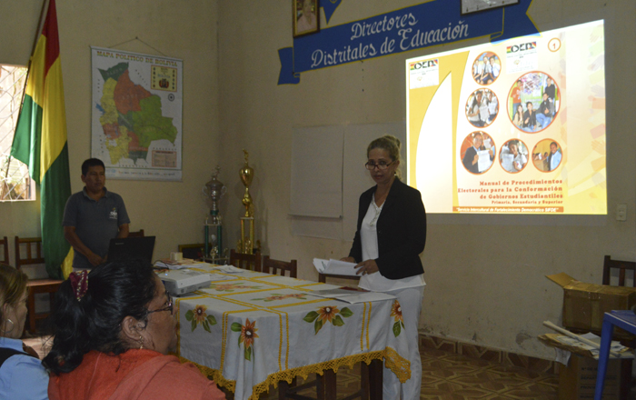 Para el cumplimiento de dicha capacitación, en el marco del convenio interinstitucional con el Servicio Distrital de Educación, se desplazaron a Guayaramerín la vocal Roxana Rivero Chávez y el técnico del SIFDE Carlos Renán Atto Callisaya, quienes durante la primer jornada disertaron sobre la historia de la democracia del Estado Plurinacional de Bolivia, los valores de la Democracia Intercultural, las prácticas democráticas en las unidades educativas y, para concluir, realizaron un simulacro sobre el procedimiento electoral en las unidades educativas.