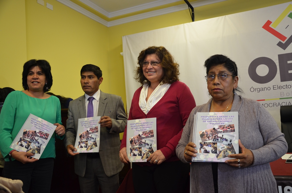El documento fue entregado a la presidenta del TSE, Katia Uriona, y a los vocales Dunia Sandoval e Idelfonso Mamani. Uriona, al momento de dirigirse al auditorio y resaltar que por primera vez en la historia de Bolivia se tiene una representación porcentual equitativa de las mujeres, mencionó que el documento servirá para trabajar en la propuesta de Ley de Organizaciones Políticas que se prevé iniciar en mayo.