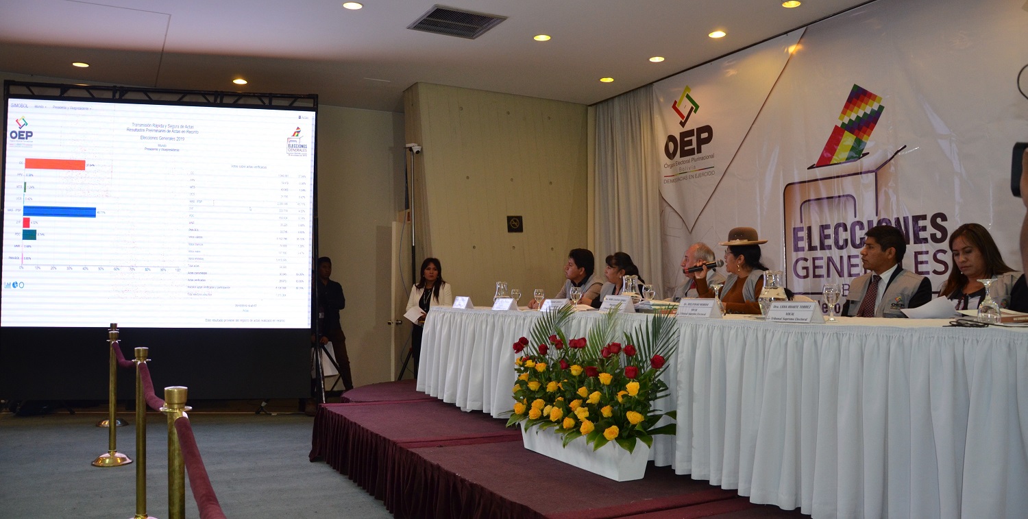 Choque, junto a la Sala Plena del TSE, dio a conocer este domingo por la noche la Transmisión de los Resultados Electorales Preliminares (TREP), con una transmisión del 89,34% de las actas electorales desde las mesas de sufragio y la verificación del 83,76% de las mismas.