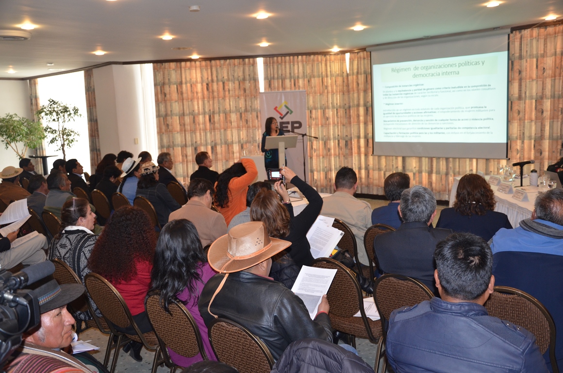 - El tercer eje contempló la participación de las Naciones y Pueblos Indígena Originario Campesinos (NPIOC), que como lo establece la Constitución Política del Estado (CPE), y las declaraciones y convenciones internacionales sobre pueblos indígenas, el Estado reconoce que los cargos electivos pueden ser postulados por agrupaciones ciudadanas, partidos políticos y por las NPIOC, como una nueva forma de participación y representación política. Se analizó también la representación directa de acuerdo a sus procedimientos en cargos electivos.