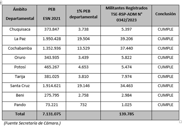 Además logró reunir un total de 139.785 registros válidos de militancia, superando así el mínimo requerido del 1.5% del Padrón Electoral Biométrico (PEB) a nivel nacional y el 1% en cada uno de los nueve departamentos del país, que exige la normativa.