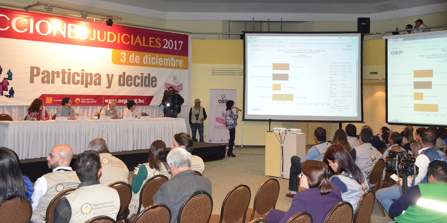 La presidenta del TSE, Katia Uriona Gamarra, resaltó la participación de los ciudadanos en las Elecciones de Altas Autoridades del Órgano Judicial y Tribunal Constitucional 2017 y manifestó que toda la información ya se encuentra disponible en la página web www.trep.orp.org.bo, la misma que irá siendo actualizada hasta alcanzar el porcentaje final del 100%.