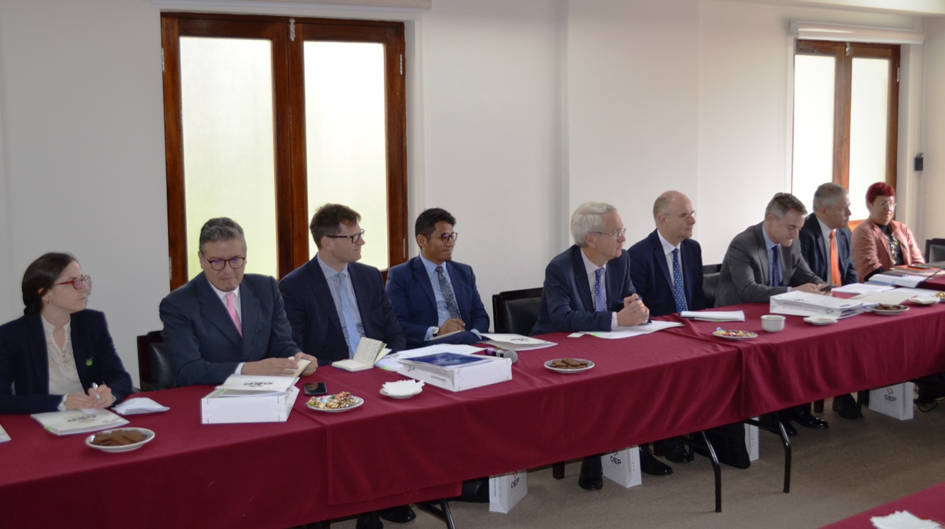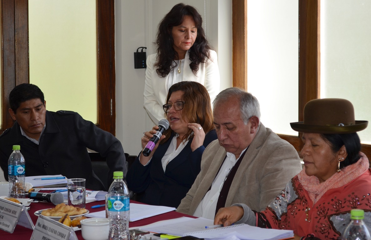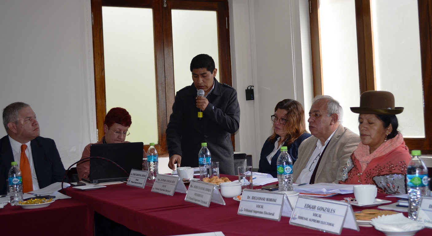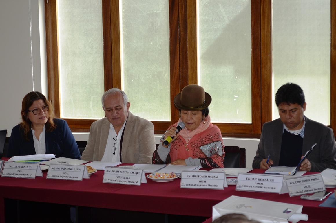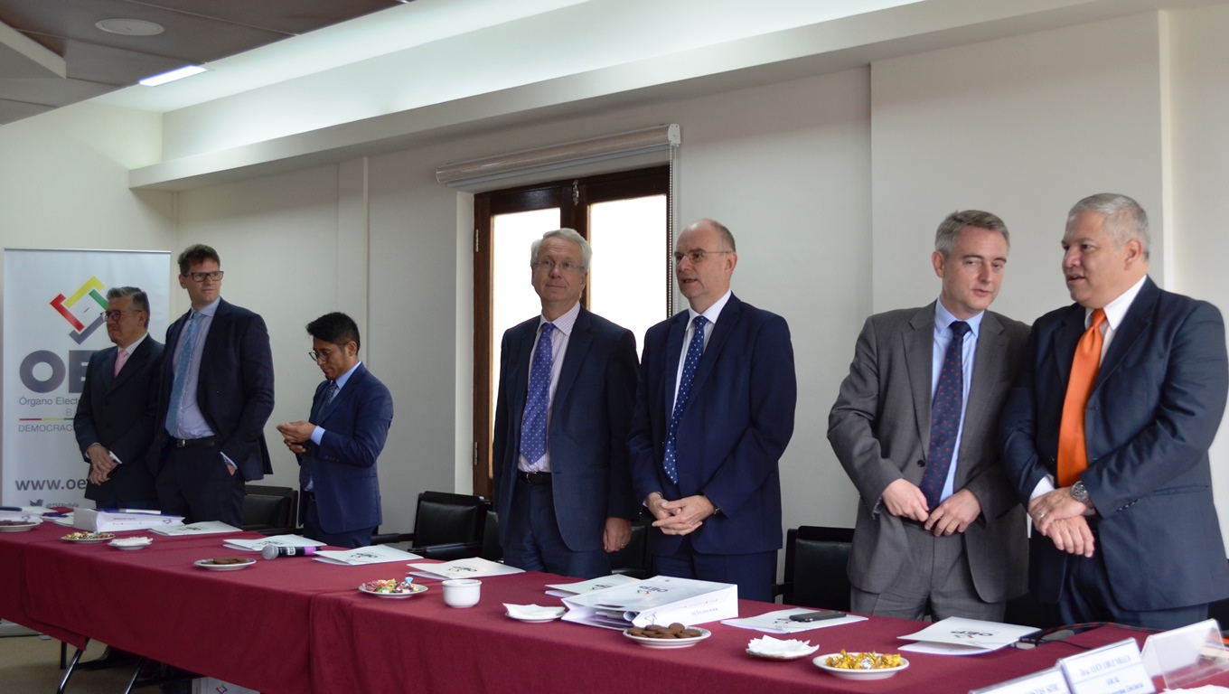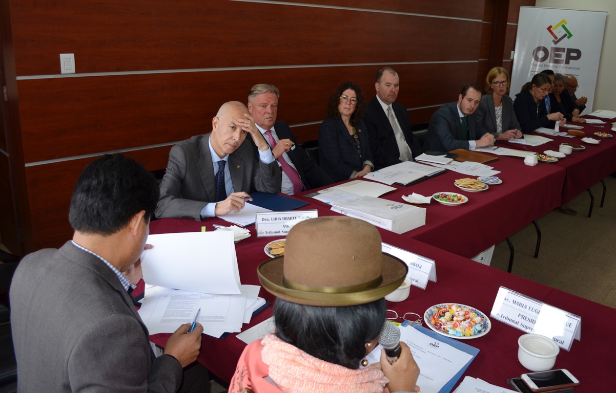 La Sala Plena del Tribunal Supremo Electoral (TSE) se reunió este jueves con representantes y embajadores de Italia, Francia, de la Unión Europea, Costa Rica, Estados Unidos, Gran Bretaña, Perú, Canadá, Alemania, España, Suecia, Suiza, Brasil y de la Organización de Estados Americanos (OEA), que tienen acuerdos de cooperación con el Órgano Electoral Plurinacional (OEP), a quienes presentó los desafíos que tiene la entidad electoral para este 2019 y los avances que logró en su trabajo en la profundización de la Democracia Intercultural.