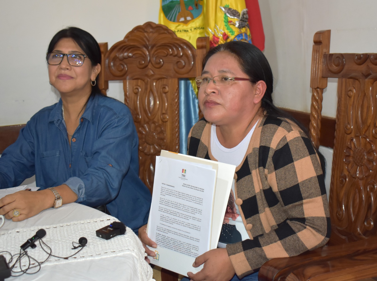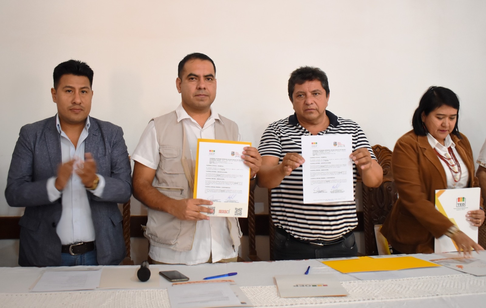 Durante el acto protocolar de firma de convenio, los vocales del Tribunal Electoral Departamental (TED) de Santa Cruz aprovecharon la oportunidad para entregar, a las autoridades municipales, originarias y campesinas, la Resolución TED SCZ- RSP Nº 002/2024, referida a la creación de nuevos recintos electorales en el municipio de San Ignacio de Velasco.