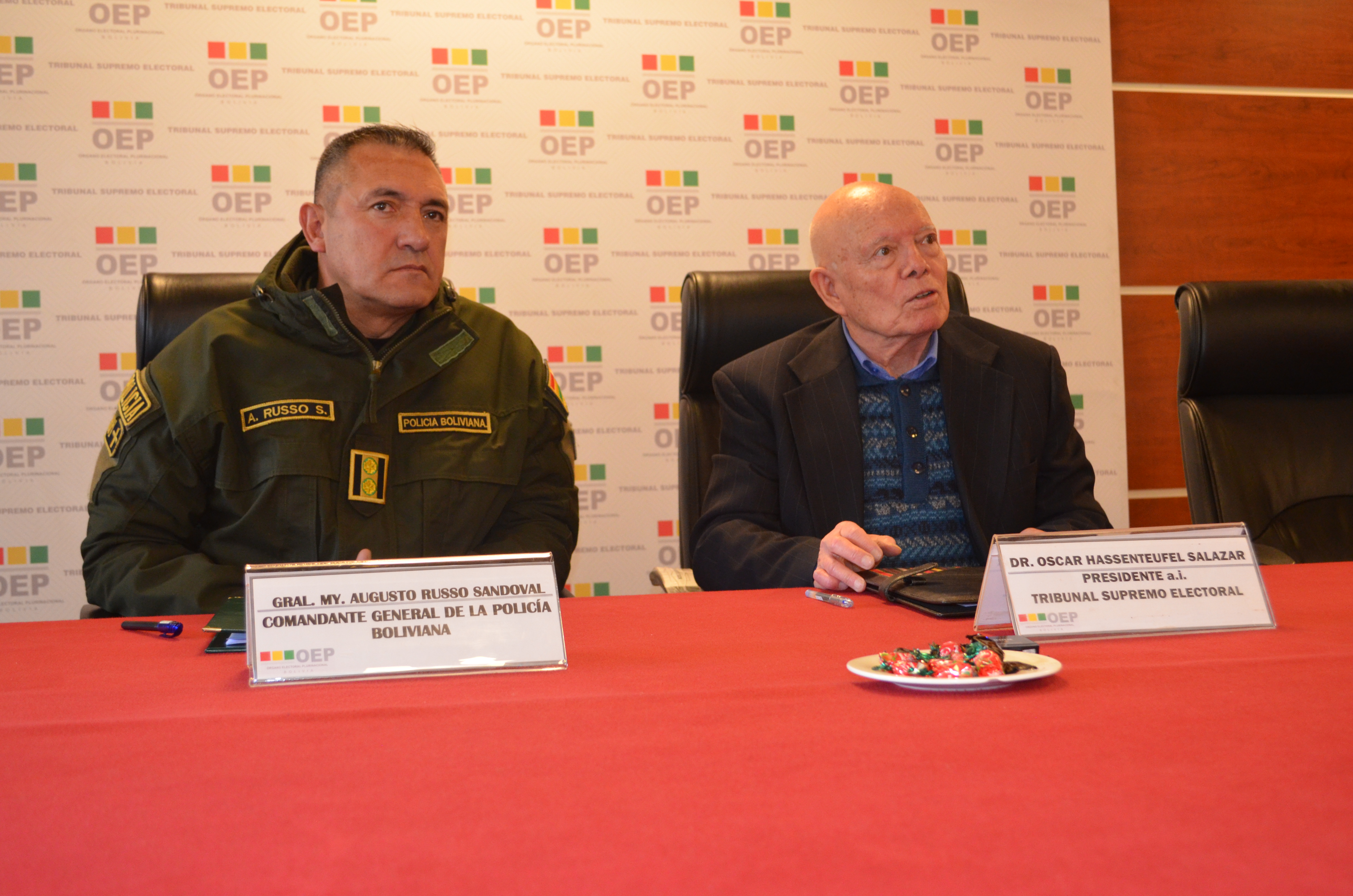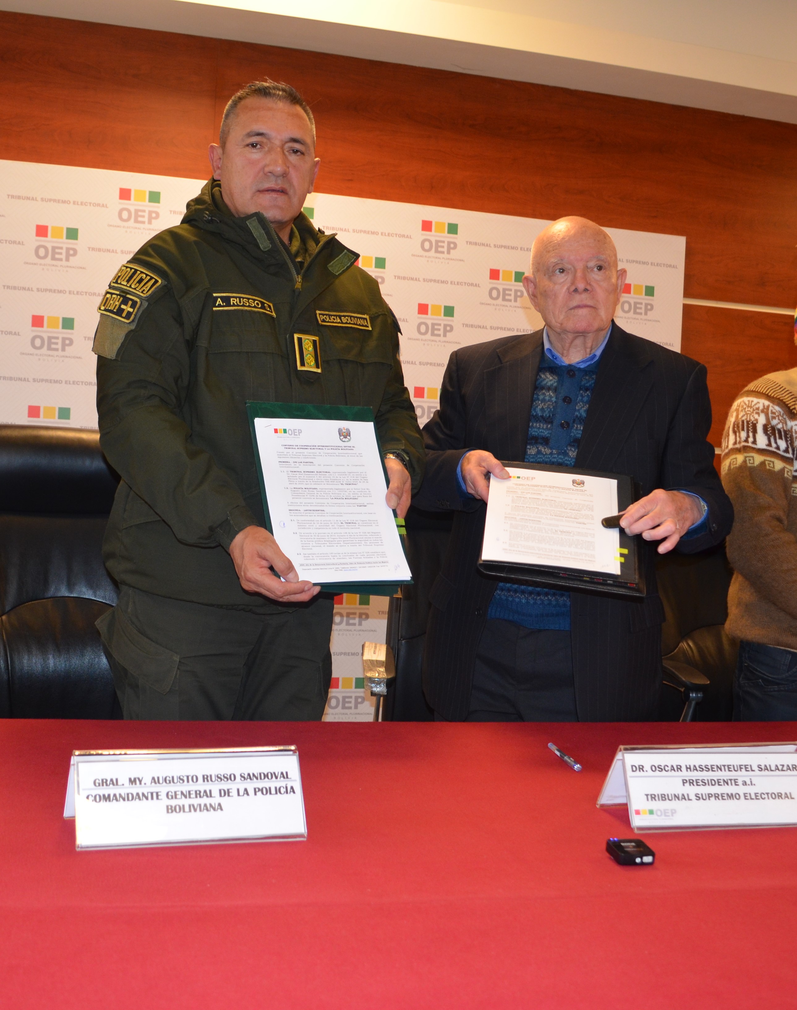 El convenio fue suscrito por el Presidente a.i del TSE, Oscar Hassenteufel Salazar y el Comandante General de la Policía Boliviana a.i. Gral My. Augusto Russo Sandoval.