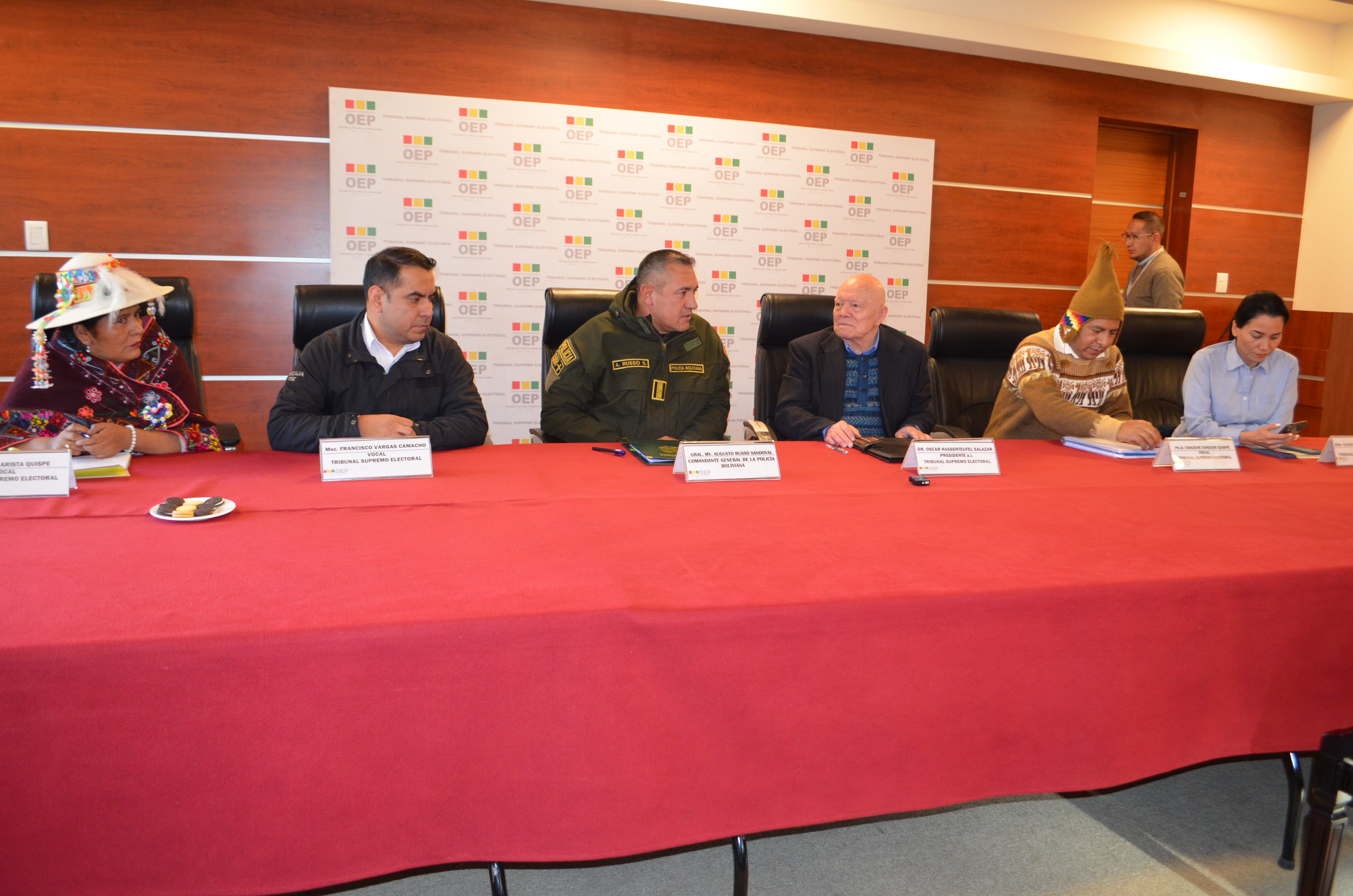 Para cada proceso electoral, el TSE suscribe convenios con la Policía Boliviana y las fuerzas armadas con el objetivo de garantizar la seguridad del proceso y de los electores.
