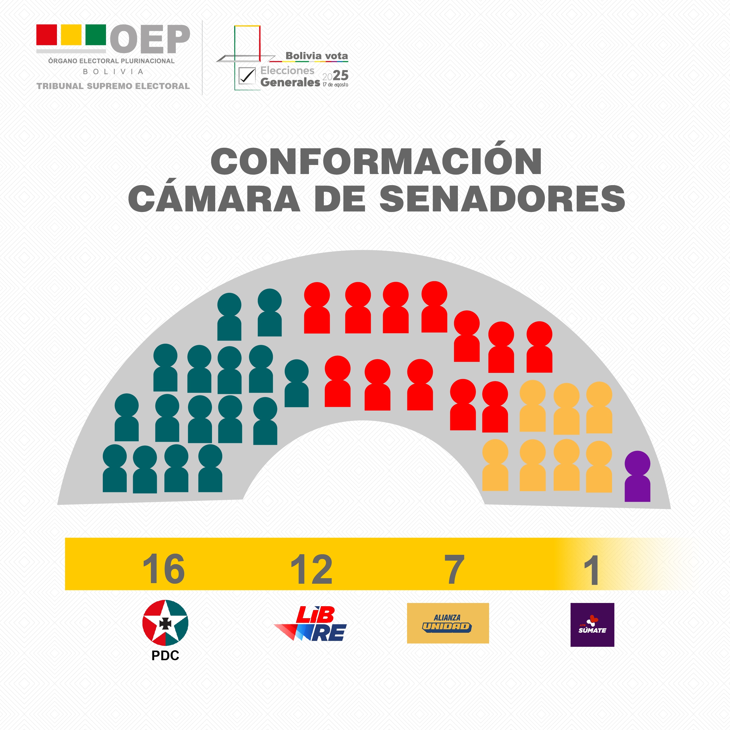 El cómputo nacional de las Elecciones Generales 2025 presentado por el Tribunal Supremo Electoral (TSE) confirma una nueva composición de la Asamblea Legislativa Plurinacional para el siguiente periodo constitucional. Las organizaciones políticas que cuentan con mayor representación son el Partido Demócrata Cristiano (PDC) y la Alianza Libre, tanto en la Cámara de Diputados como en la de Senadores.