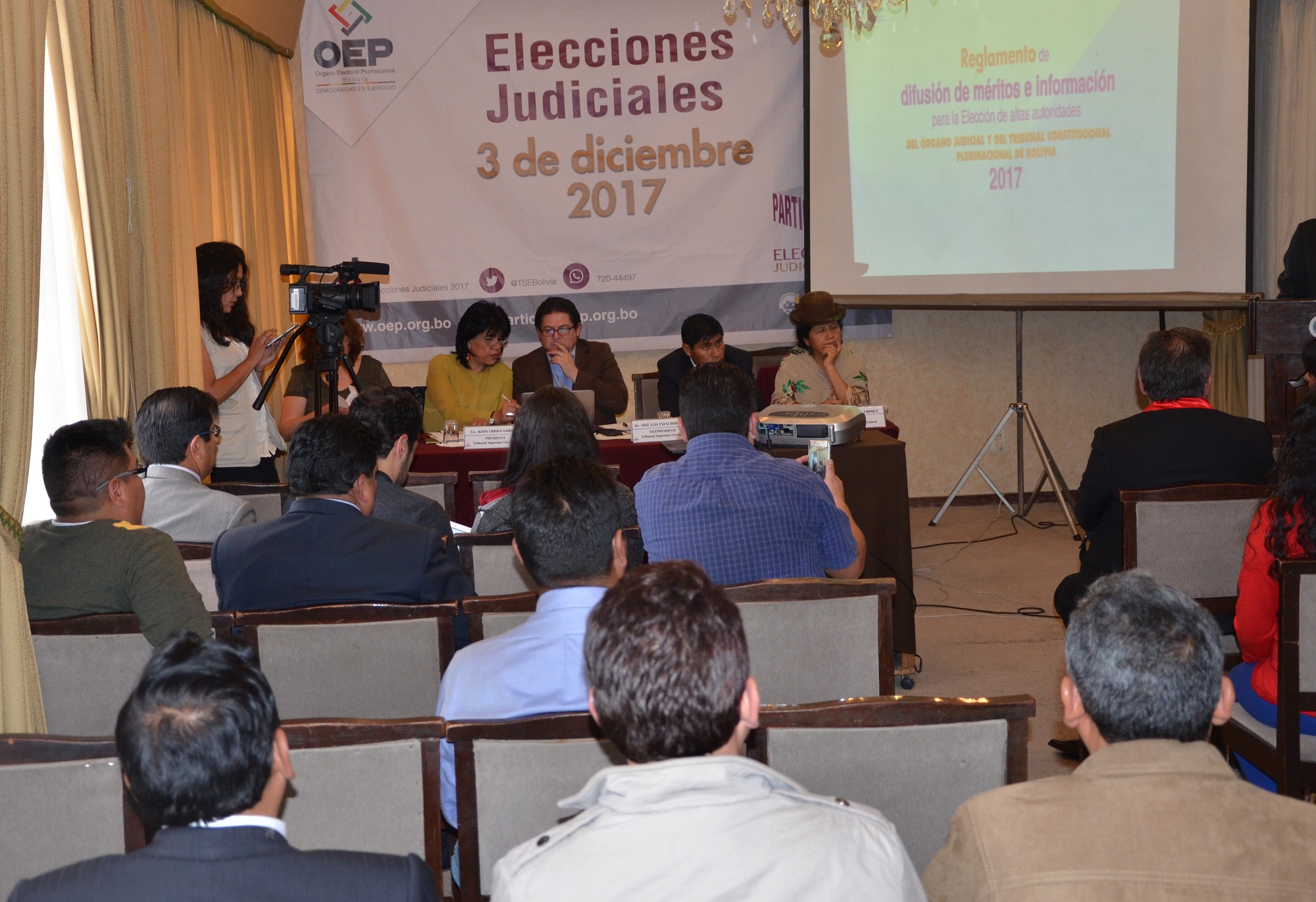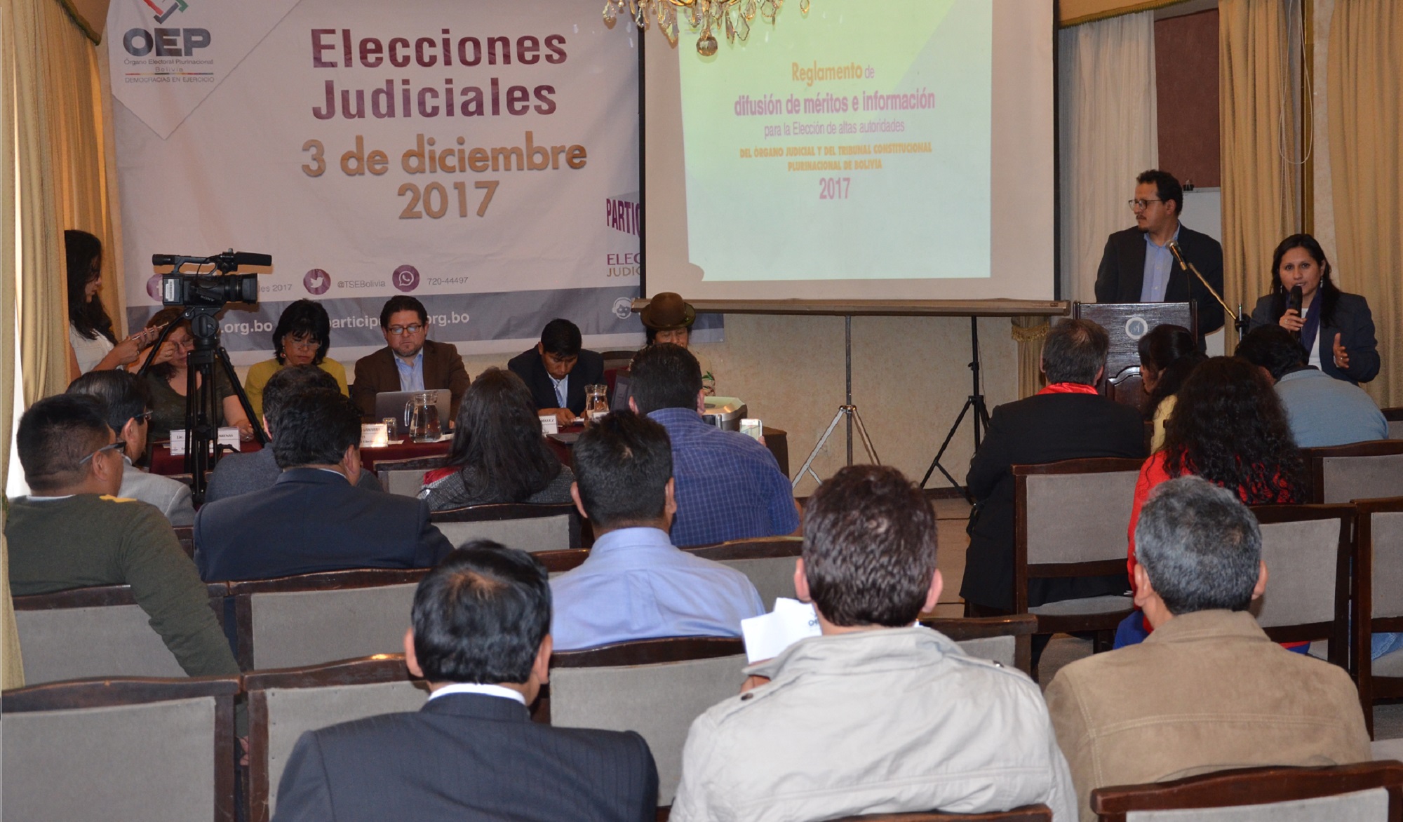 El Tribunal Supremo Electoral (TSE) socializó este lunes 9 de octubre el Reglamento de Difusión de Méritos e Información con las candidatas y candidatos del Consejo de Magistratura y del Tribunal Agroambiental, para que los mismos conozcan en profundidad la normativa de este proceso. El evento se realizó en La Paz, con la presencia de la presidenta del TSE, Katia Uriona y vocales de la institución electoral.