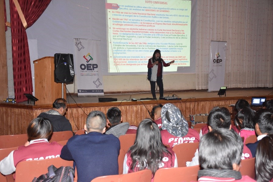 La vocal Revollo explicó el contexto histórico, político, social y jurídico de los procesos electorales generales y estudiantiles de Bolivia; manifestó que desde la época de la Colonia hasta la etapa republicana los pueblos indígenas lucharon por conquistar sus derechos. Finalmente, la democracia se recuperó en 1982, concluyeron los gobiernos de facto y se empezó a construir una democracia con equidad y justicia social, lo que finalmente fue establecido en la Constitución Política del Estado de 2009, donde se amplía el ejercicio democrático y se profundiza la participación de la mujer, de los pueblos indígenas, y de la juventud.