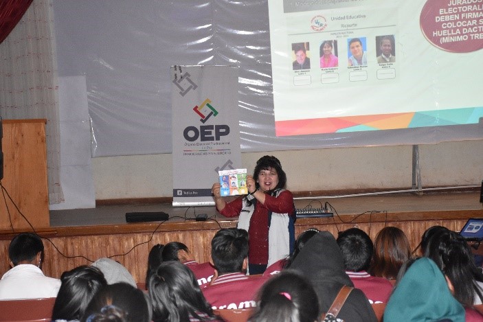 La vocal del TED La Paz, Marianela Revollo Alcoreza, encargada de brindar el taller, manifestó la importancia de construir y profundizar la Democracia Intercultural. En este marco, abordó con las y los estudiantes el concepto de democracia, sus orígenes, la Democracia Intercultural vigente en el país y las tres formas de ejercicio reconocidas en la Constitución Política del Estado: Democracia Representativa, Directa y Participativa, y Comunitaria.