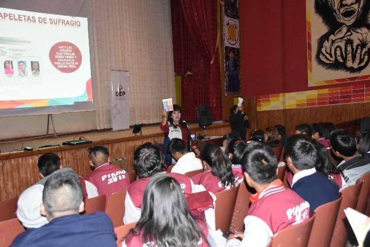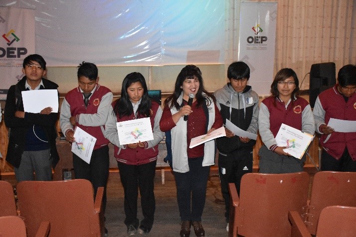 Más de 200 estudiantes de 3ro, 4to, 5to y 6to secundaria de la Unidad Educativa Pedro Kramer, del municipio de Corocoro, en La Paz, participaron en el taller que organizó el Tribunal Electoral Departamental (TED) de La Paz sobre Democracia Intercultural y Paritaria, gobiernos estudiantiles y liderazgo.