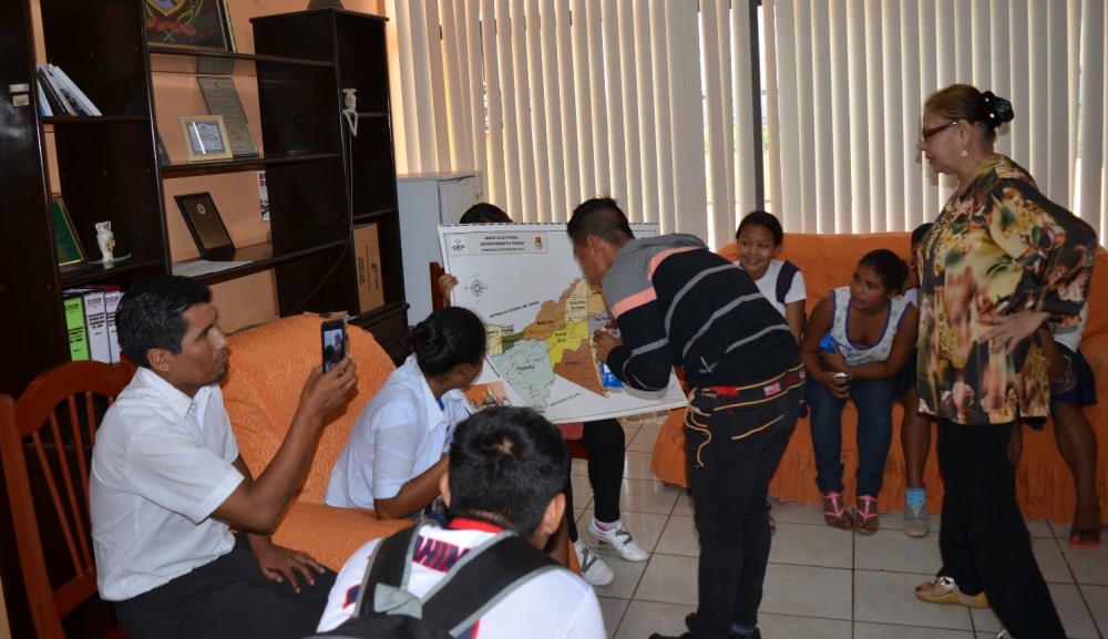 Por su parte la Vocal de Geografía Electoral, Olga Durán Destre, notando que las y los estudiantes se encontraban muy tímidos, incentivó su participación preguntando si alguien podía ubicar en el mapa electoral su comunidad. Uno de los estudiantes se levantó y, con su dedo, señaló la ubicación, quebrando así el hielo entre estudiantes y autoridades electorales.