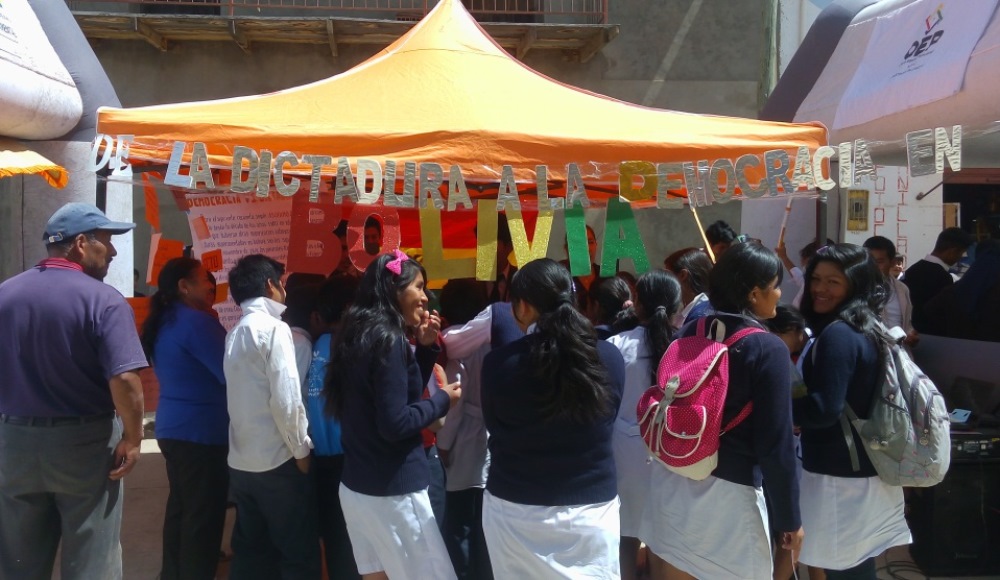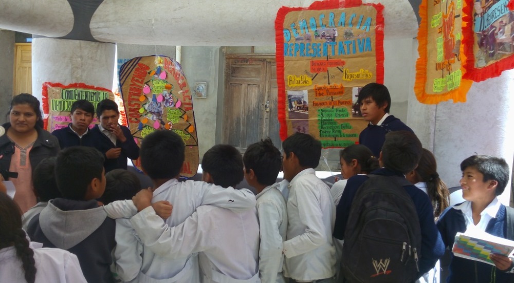La feria se desarrolló el 6 de septiembre con 20 estudiantes de secundaria, quienes usaron diversas herramientas para explicar temas como la “Transición de la dictadura a la Democracia”, “Democracia Intercultural” y “Equidad de género y participación femenina”.