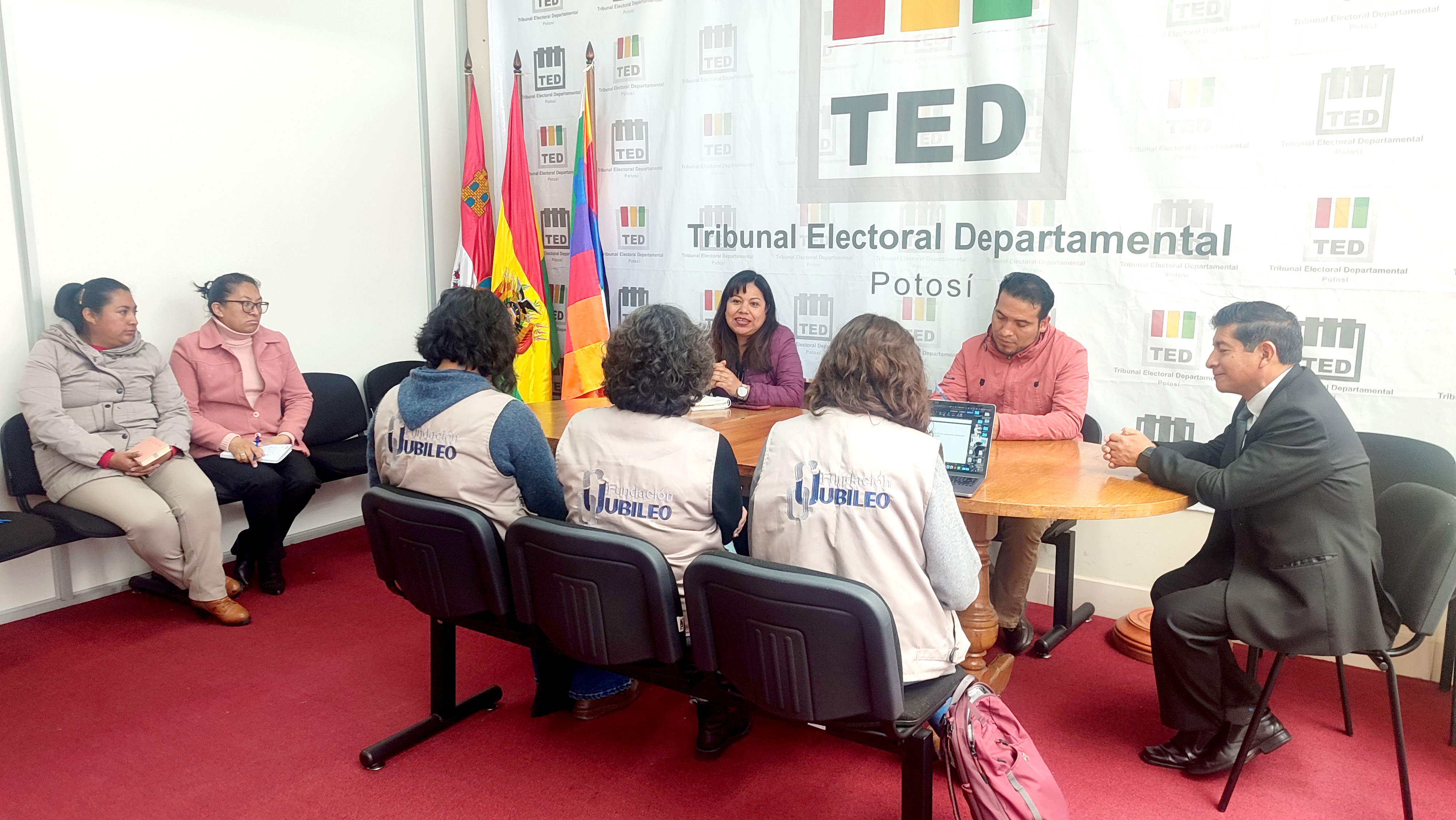 La Misión de Observación Electoral (MOE) de la Fundación Jubileo visitó el Tribunal Electoral Departamental (TED) de Potosí para realizar el seguimiento a la evaluación del proceso electoral 2025 y conocer los avances institucionales rumbo a las Elecciones Subnacionales 2026. El encuentro permitió revisar los procedimientos operativos, logísticos y de capacitación aplicados por el TED durante la primera y segunda vuelta de las Elecciones Generales 2025.