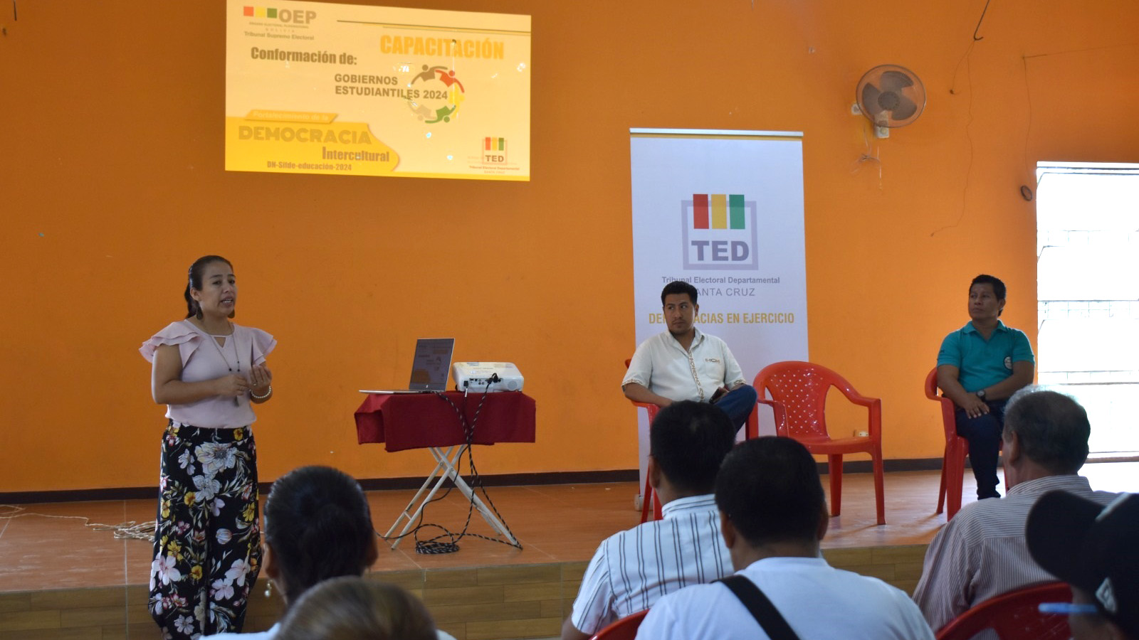 Las capacitaciones se desarrollaron dando cumplimiento al convenio suscrito entre el Ministerio de Educación y el Tribunal Supremo Electoral para fortalecer la democracia intercultural en las unidades educativas del departamento de Santa Cruz, y en el marco del artículo 110 parágrafo I y II de la RM 001/2024 sobre Gobiernos Estudiantiles, Defensor y Defensora Estudiantil.
