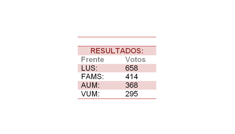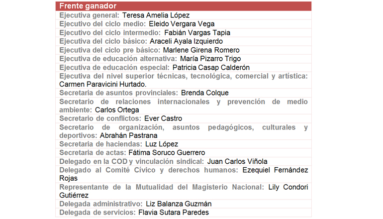 Al culminar el escrutinio y cómputo de los votos, resultó ganador el frente LUS (Liderazgo de Unidad Sindical) encabezado por la Profesora Teresa Amelia López como flamante ejecutiva general de la Federación de Trabajadores de Educación Urbana de Tarija por el periodo 2016-2018.